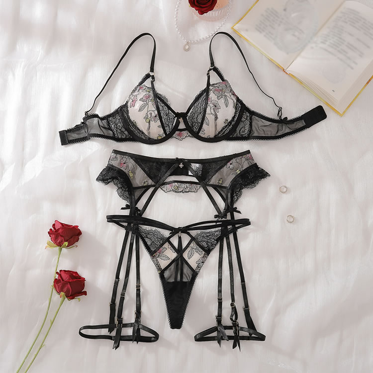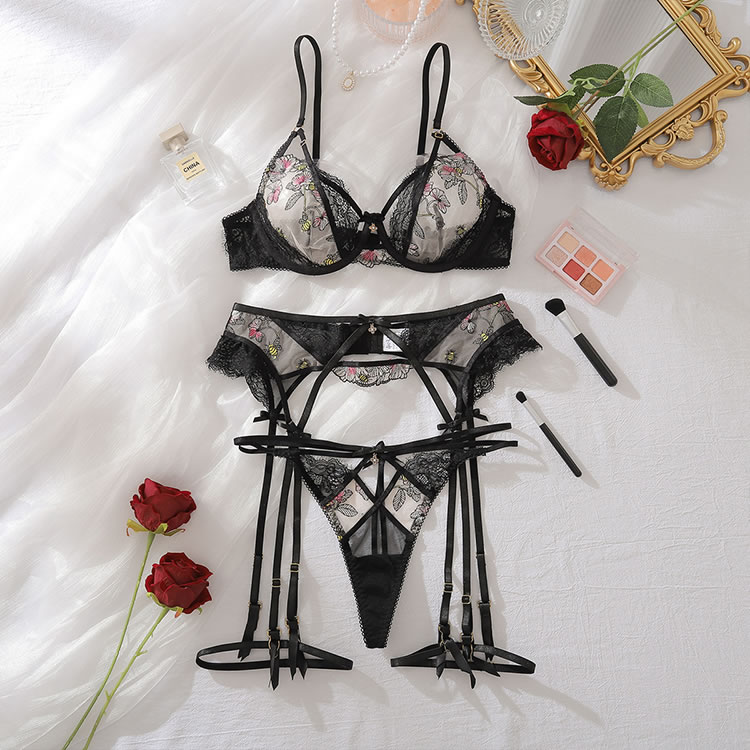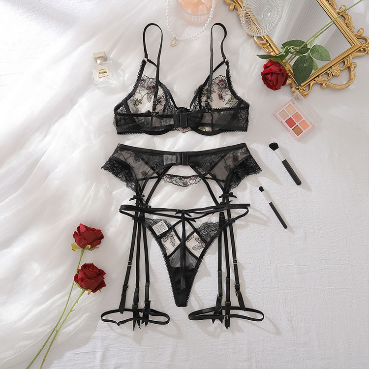 Elevate your lingerie game with this bold floral lace bra and garter set. The intricate black lace is adorned with vibrant floral embroidery, creating a striking contrast that accentuates your curves. The adjustable straps and garters ensure a comfortable fit, making it perfect for those who want to feel both confident and alluring.