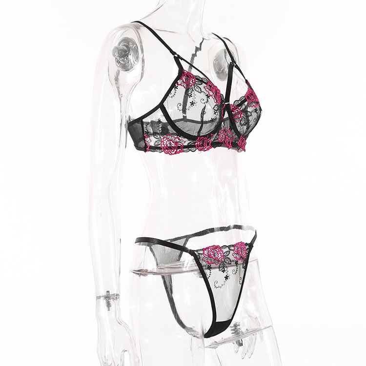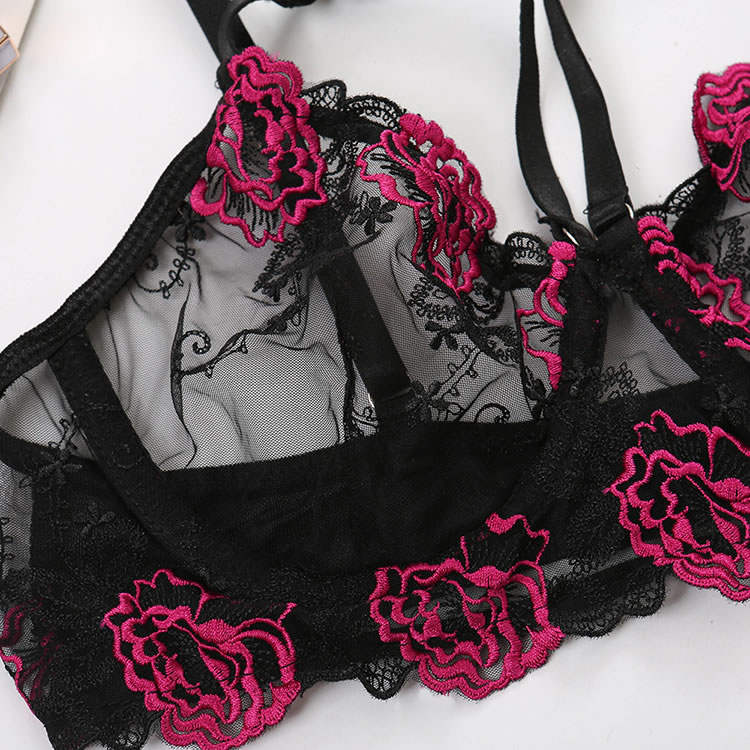 Embrace a bold and vibrant look with this striking floral lace bra and panty set. The intricate black lace is beautifully contrasted with vivid pink floral embroidery, creating a visually captivating design. The strappy back adds an extra layer of allure, making it perfect for those who want to feel both confident and stylish.