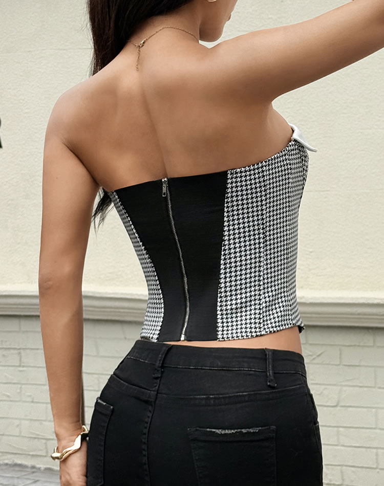 Elevate your style with this bold houndstooth corset, featuring a striking white trim that adds a touch of contrast and elegance. The structured design ensures a flattering fit, while the strapless neckline offers a sleek and modern look. Perfect for making a statement at parties or adding an edgy twist to your everyday outfits.