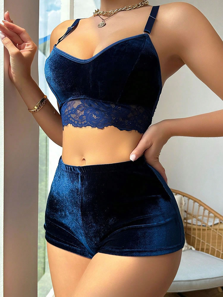 Elevate your lingerie collection with this stylish navy velvet set that includes a supportive bra and matching shorts. The bra features a lace trim that accentuates your curves, while the shorts offer a comfortable fit. Ideal for adding a trendy and captivating vibe to your intimate moments.