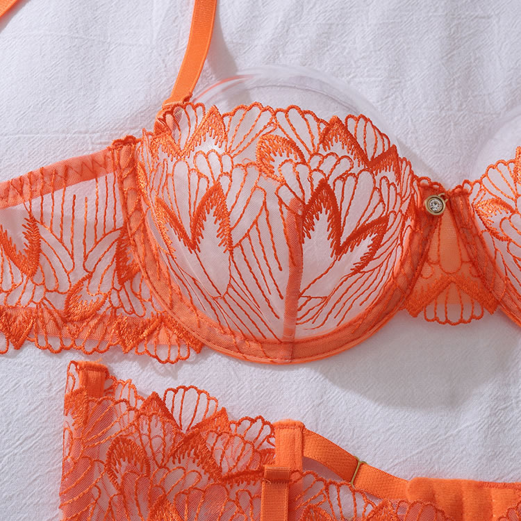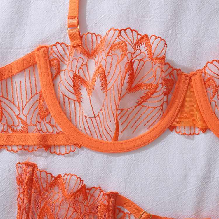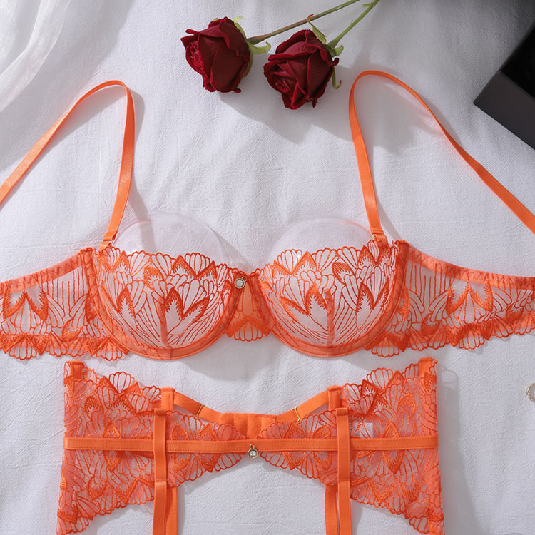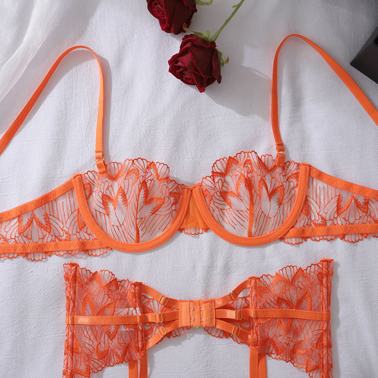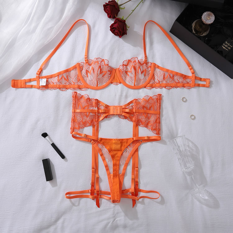 This vibrant orange lace lingerie set is perfect for making a statement. The bra features intricate lace detailing and a deep V-neckline, while the matching thong and garters add a touch of allure with their sheer fabric and adjustable straps. Ideal for those who want to feel confident and daring in their intimate moments.