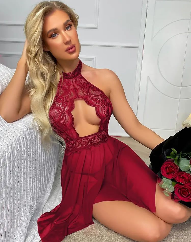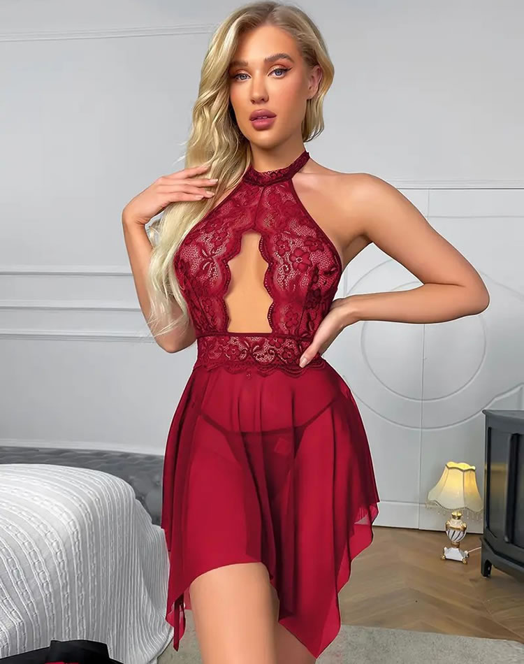 This striking red lace halter dress features a high neckline and an open back, creating a bold and eye-catching silhouette. The intricate floral lace detailing adds a touch of elegance, while the asymmetric hemline provides a playful and modern twist. Perfect for making a statement at special events or romantic evenings.