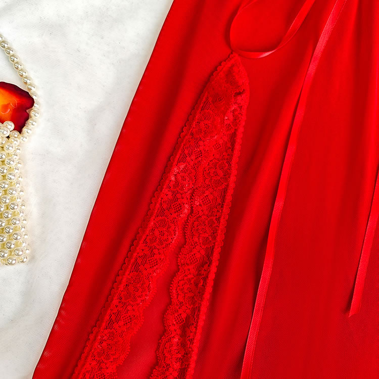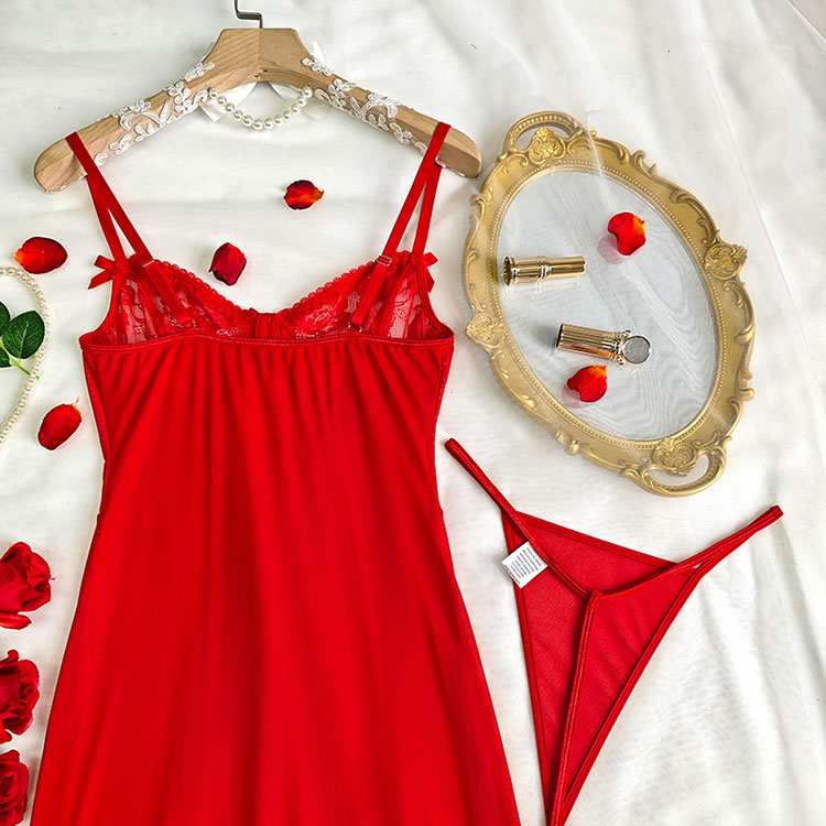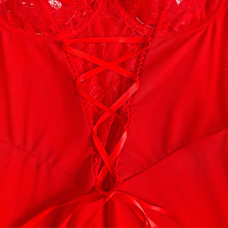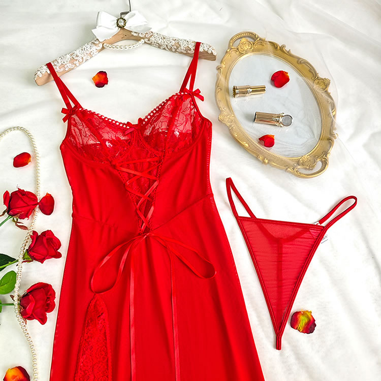 This striking red lingerie dress features a lace-adorned bustier top with underwire support and delicate embellishments along the cups, offering both shape and elegance. The fitted silhouette hugs the body from bust to hip, accentuating curves with confidence. A high front slit reveals a bold leg line, while thin spaghetti straps and a low back add drama. Designed with a drawstring waist detail, it enhances the figure and adds a touch of playful allure—perfect for making a statement at night or wearing as a daring piece of intimate fashion.