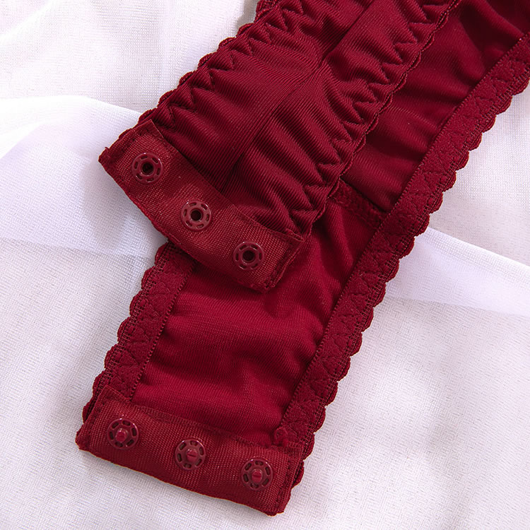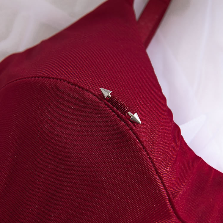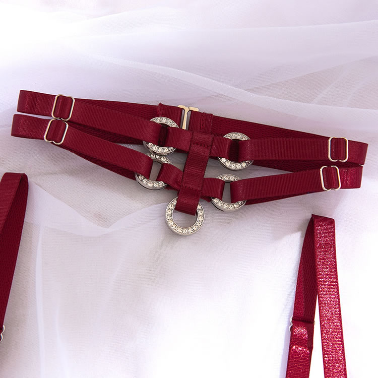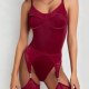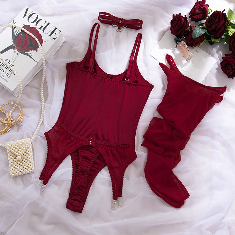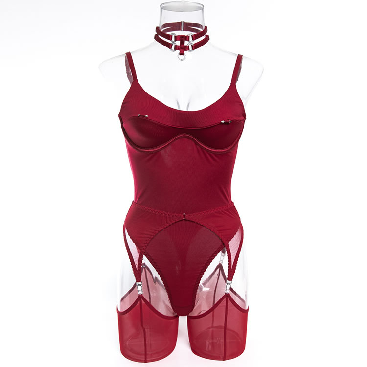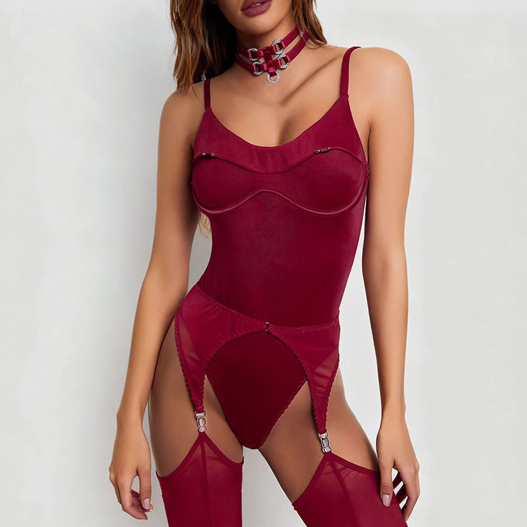 This bold red bodysuit combines structured design with daring cutouts for a powerful and confident look. Featuring a sleek, form-fitting silhouette with a high-cut leg opening, it’s crafted with smooth fabric and reinforced seams that accentuate the curves. The front includes a unique wave-shaped panel detail, while the back showcases a deep V-cut and open thighs, connected by adjustable garter straps. Paired with matching sheer thigh-highs and a statement choker, it’s made for those who want to make a strong impression.