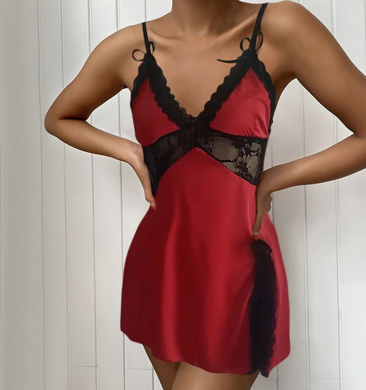 This striking red satin nightgown is designed to make a statement. The elegant lace trim adds a touch of sophistication, while the soft satin fabric ensures ultimate comfort. The deep V-neck and side slit enhance its allure, making it perfect for those who love bold and stylish lingerie.