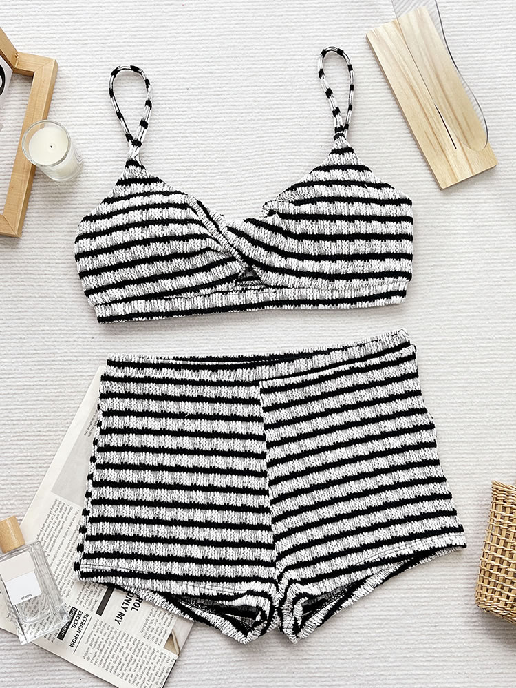 Make a statement in this bold black and white striped bikini. The twist front top adds a unique touch, while the high-waisted bottoms ensure a flattering fit. Perfect for those who want to feel confident and stylish by the pool or beach.