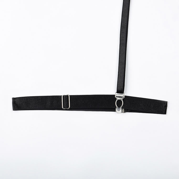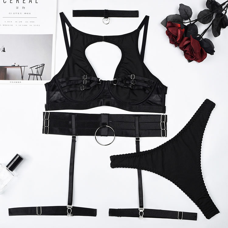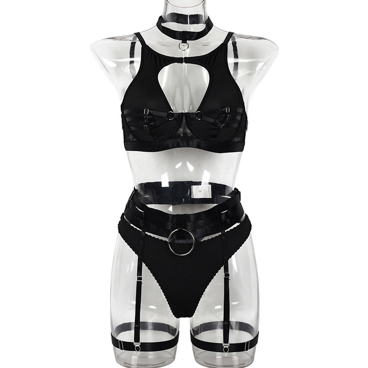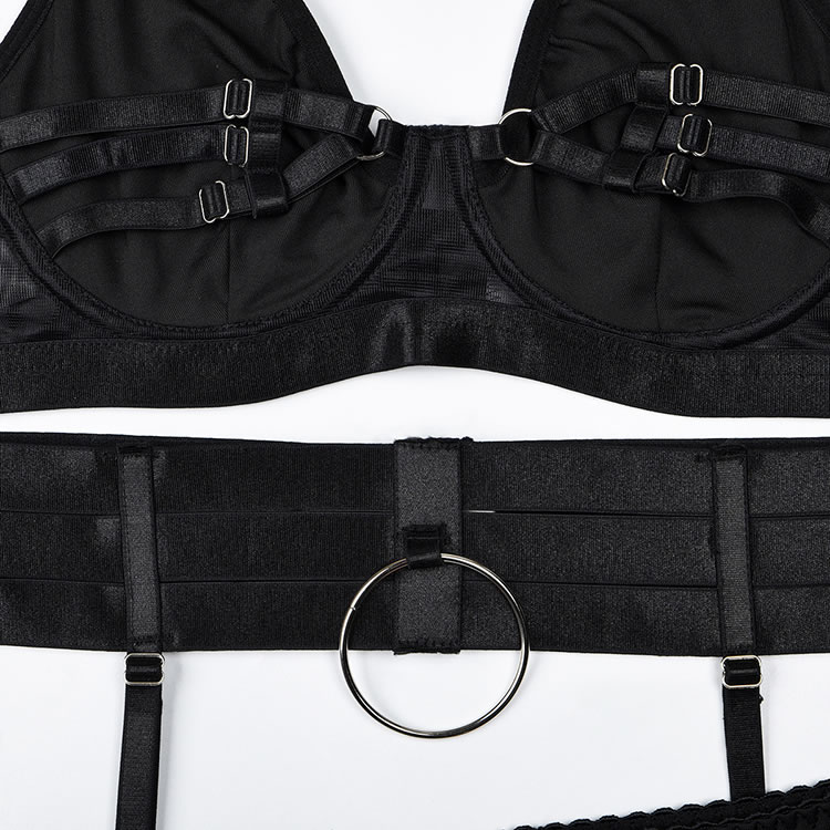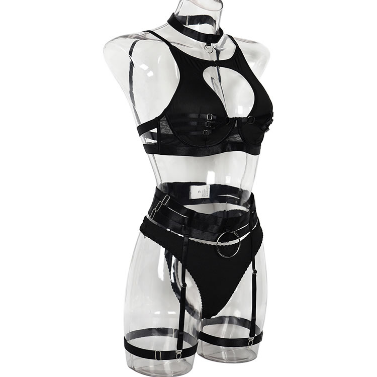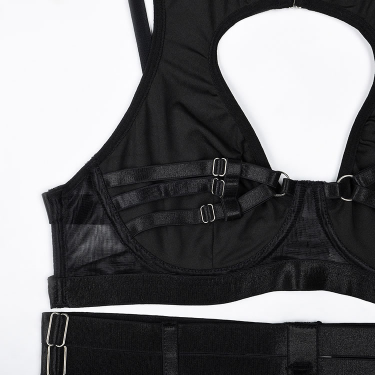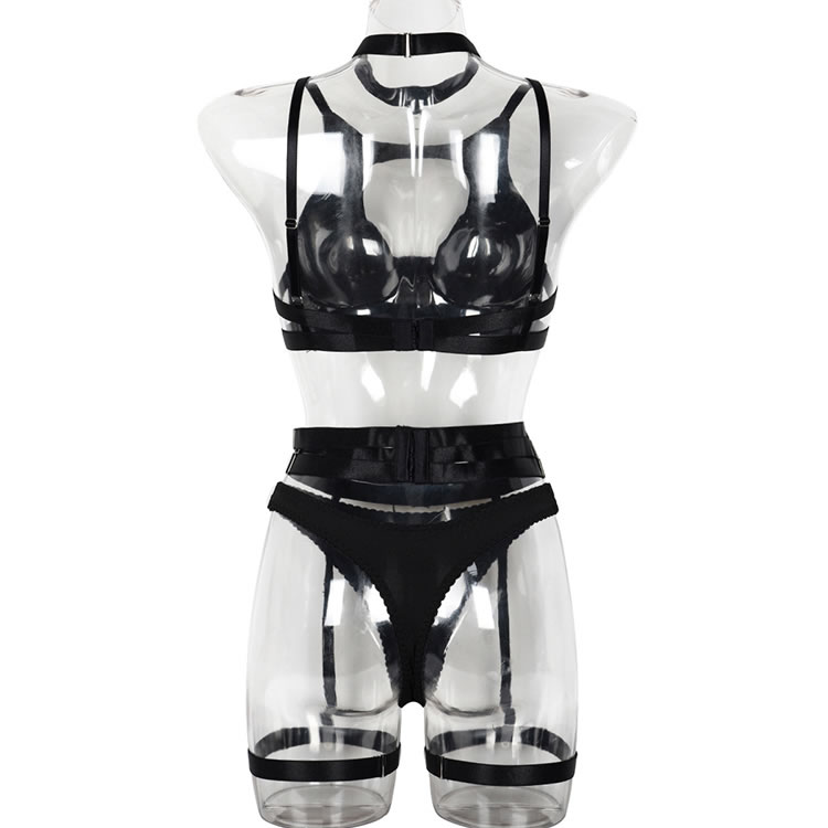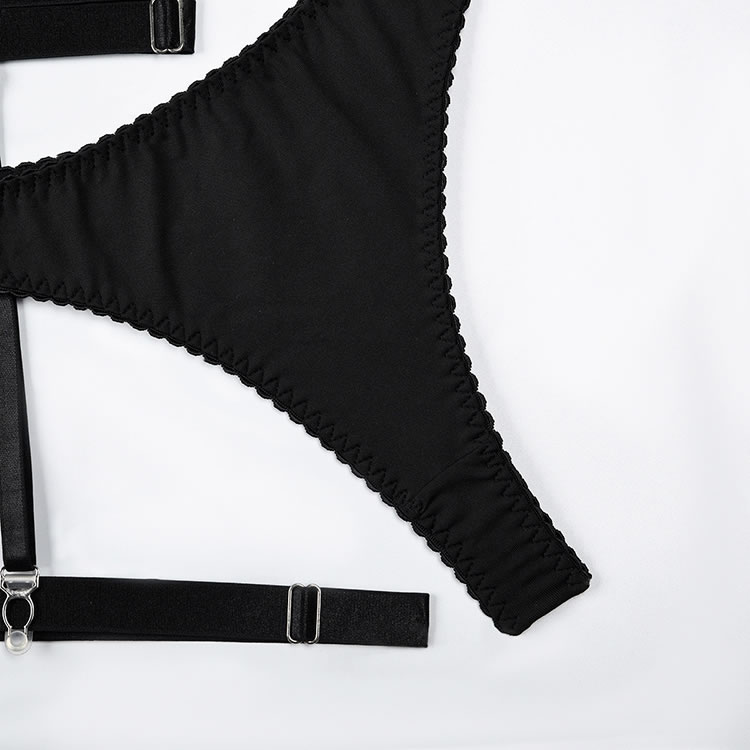 Long for a sexy evening with your honey in this stunning bra set featuring a high neckline, underwire cups with strappy detailing, adjustable spaghetti straps, a hook and eye back closure, a matching high waisted garter belt with adjustable garter straps, adjustable wraparound leg garters, and a matching thong panty.
