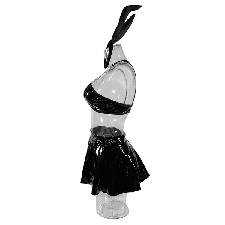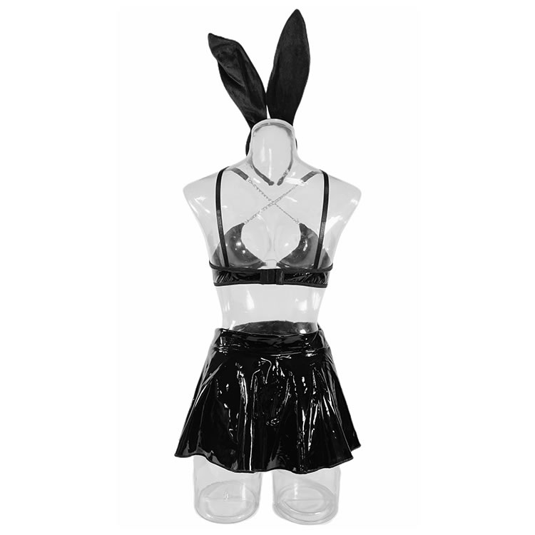 Hop into something sexy like this Bunny Vixen lingerie costume featuring a vinyl bra top, triangle cups, criss-cross strappy bust detailing, a hook and eye back closure, a mini skirt, and a matching bunny ear headband.