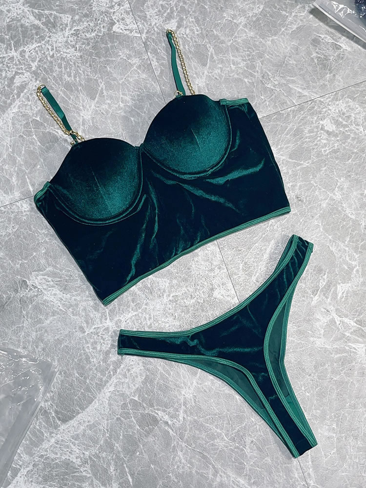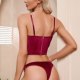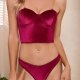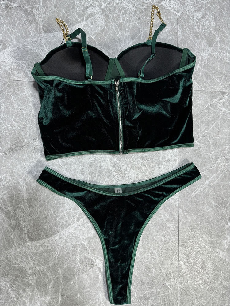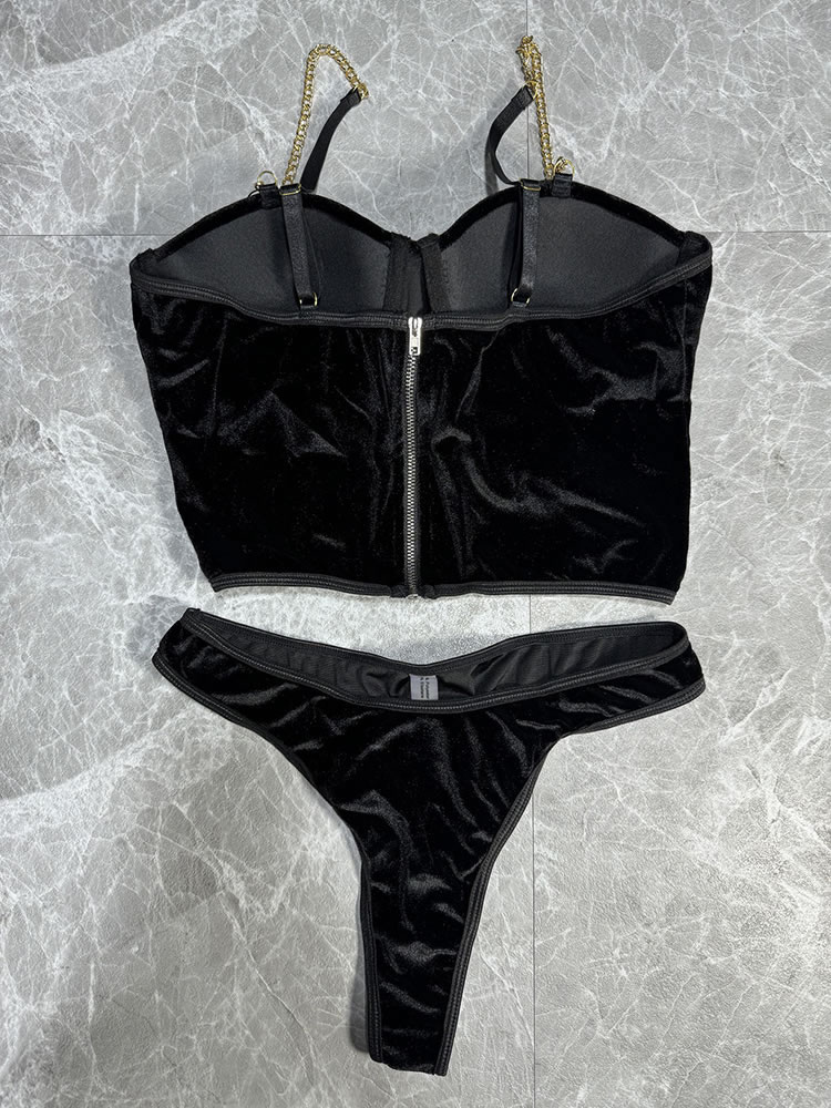 This striking two-piece set features a bold burgundy velvet finish that adds a touch of drama to any intimate moment. The structured crop top includes adjustable straps and a central back zipper for a customizable fit, while the high-cut thong bottom enhances curves with a sleek silhouette. Designed with attention to detail, it combines comfort and style for a confident, modern look.