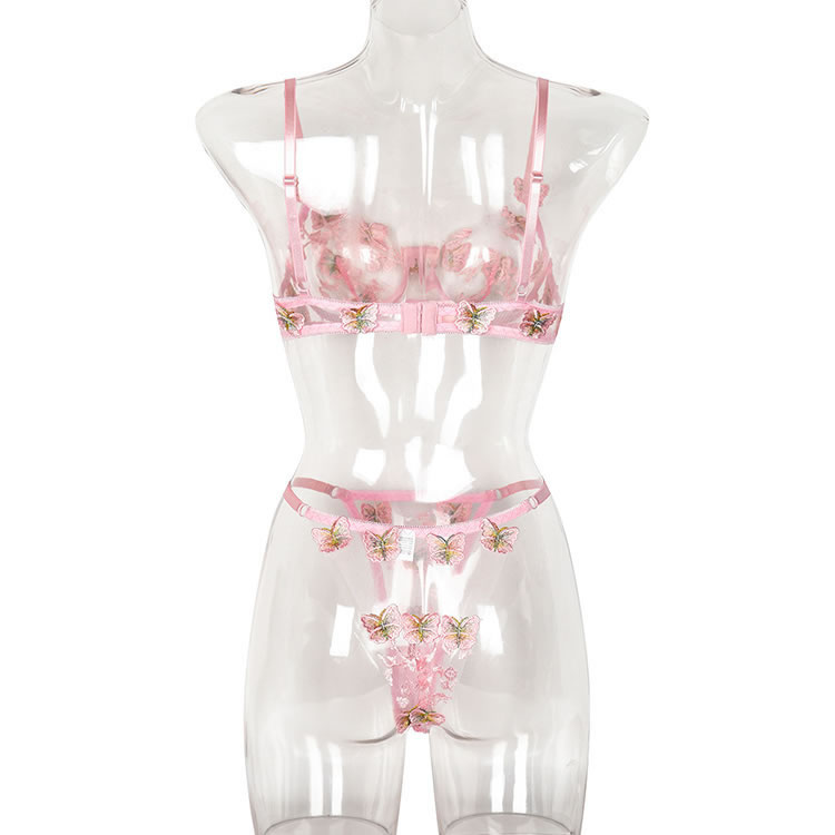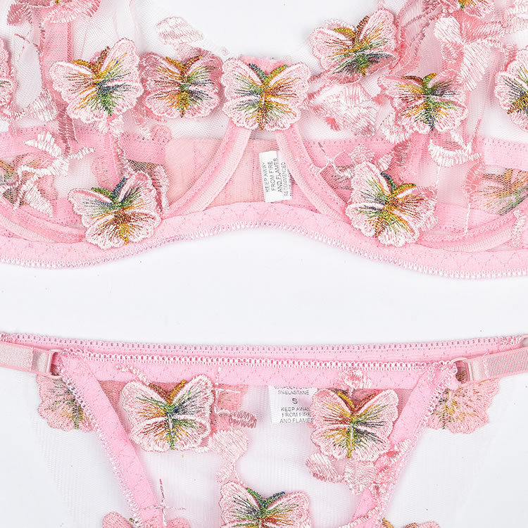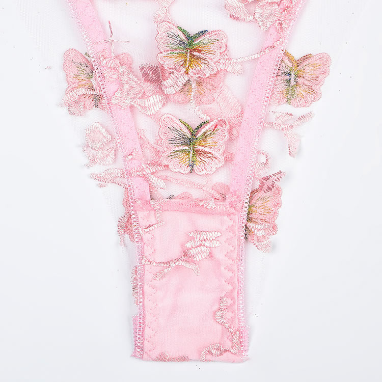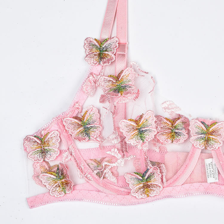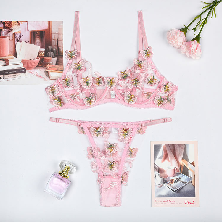 Leave little to the imagination in this sexy bra set featuring sheer mesh underwire cup, embroidered butterfly appliques, adjustable spaghetti straps, a hook and eye back closure, and a matching panty with a thong cut back.