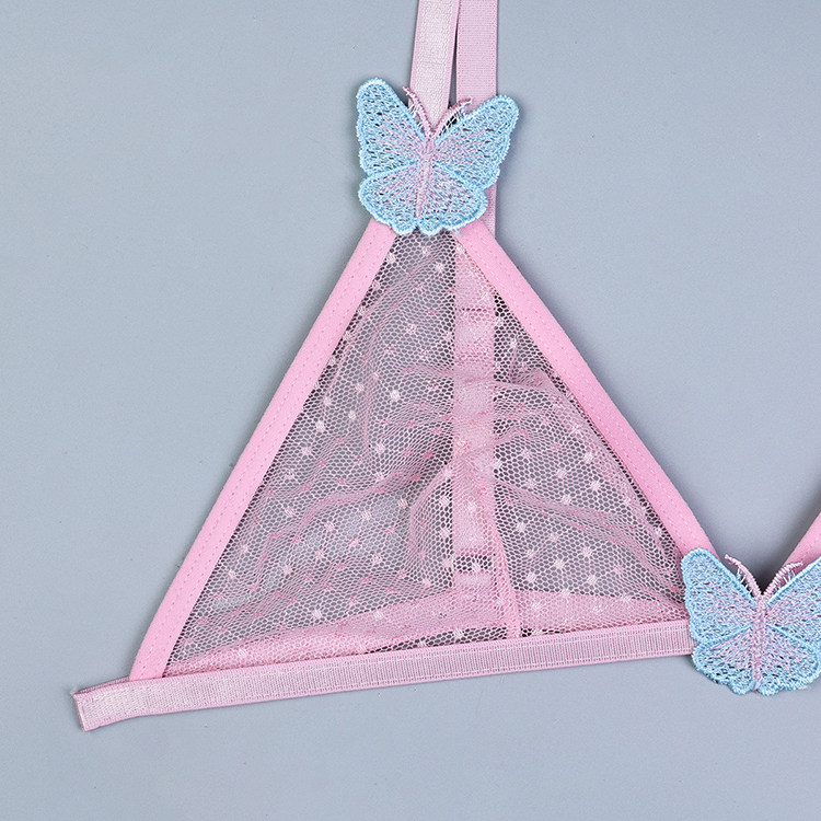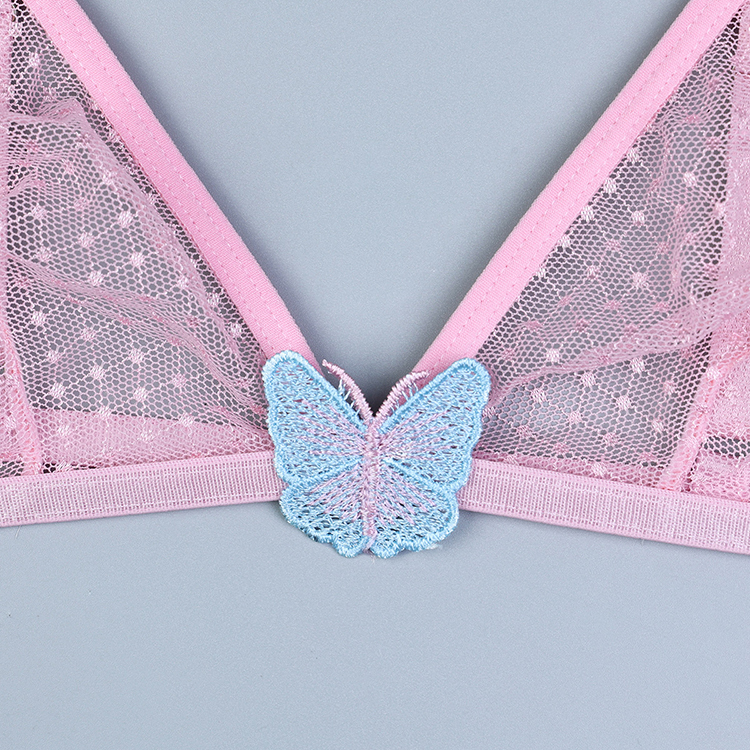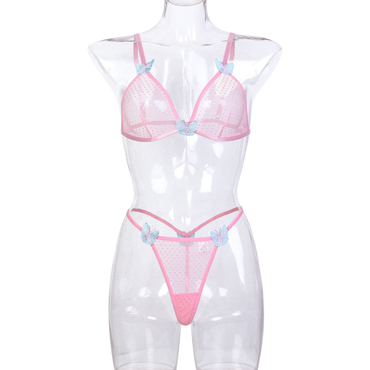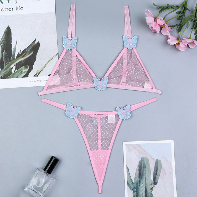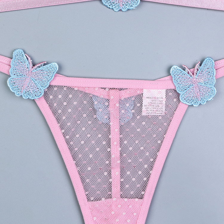 Leave little to the imagination in this sexy bra set featuring sheer mesh cups, adjustable spaghetti straps with butterfly appliques, a hook back closure, and a matching panty with butterfly appliques, and a thong cut back.