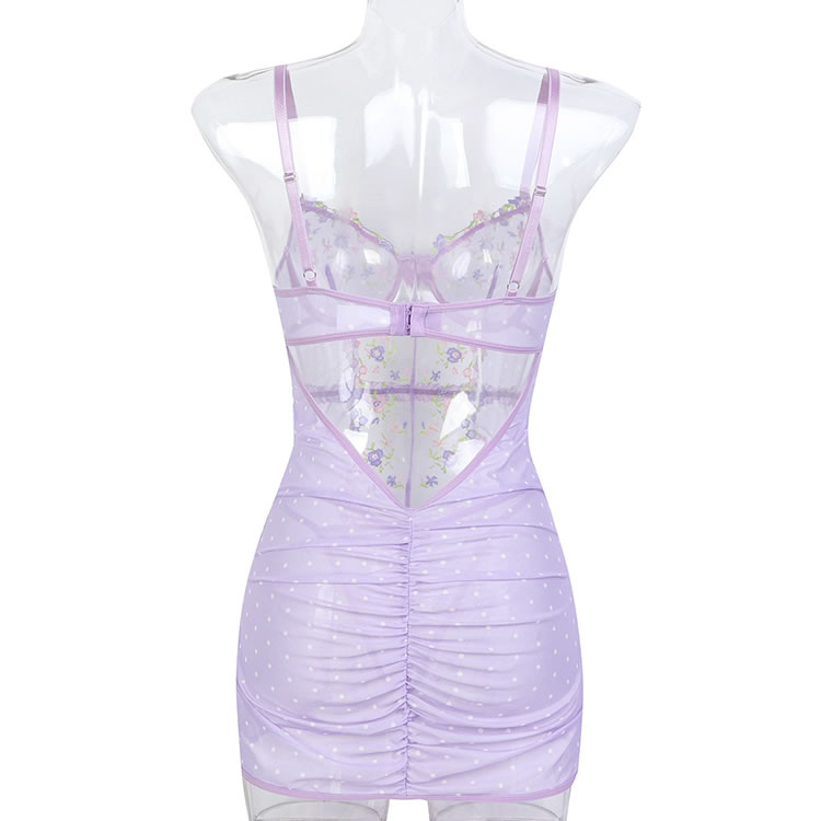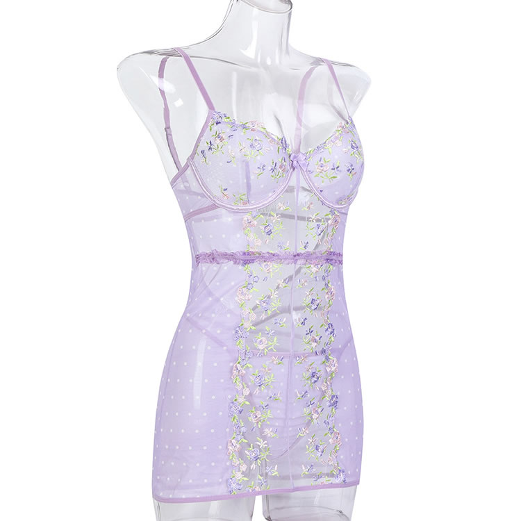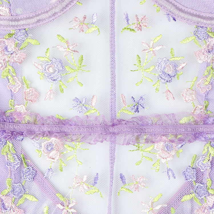 Embrace a fresh and flirty look perfect for cozy mornings with this sexy babydoll set. It features underwire cups with delicate floral embroidery, adjustable spaghetti straps, and a hook-and-eye back closure with a keyhole. The sheer mesh and lace skirt, paired with a matching panty, adds a seductive yet playful touch to this charming ensemble.