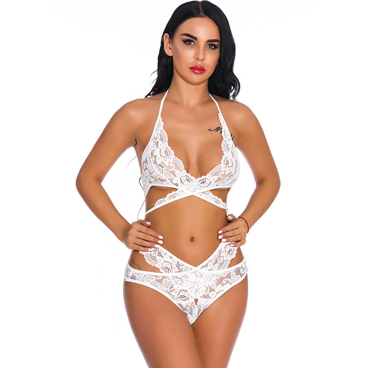 Let your hair down in this ultra lovely bra set featuring sheer lace cups with criss-cross underbust straps, halter ties, and a matching criss-cross lace panty with a small front and back keyhole, and a cheeky cut back.