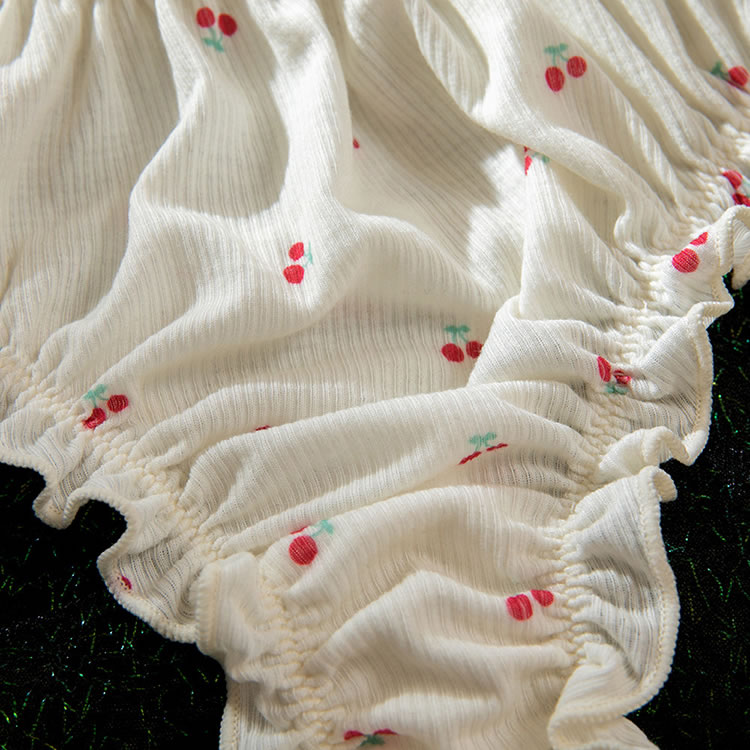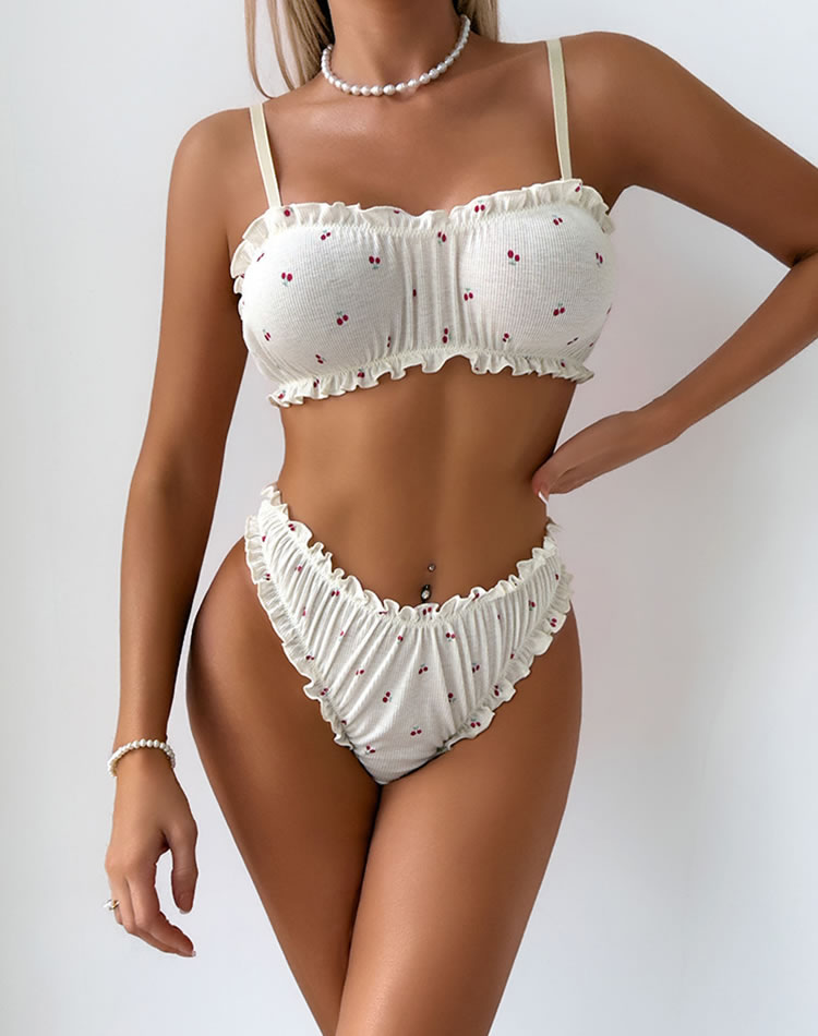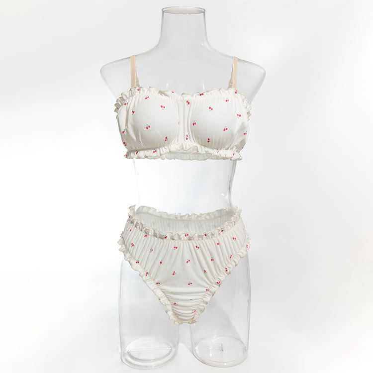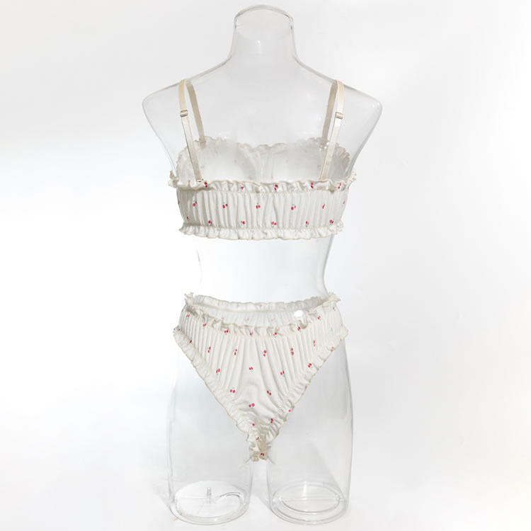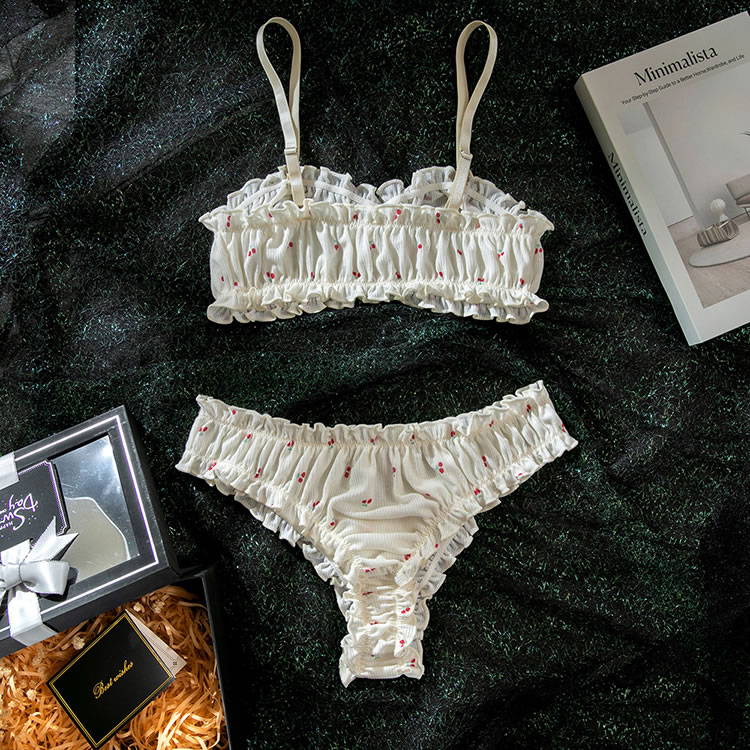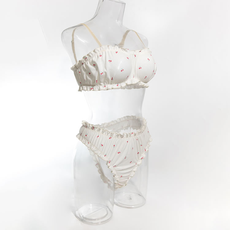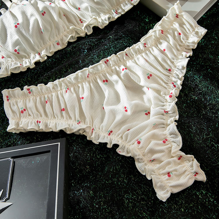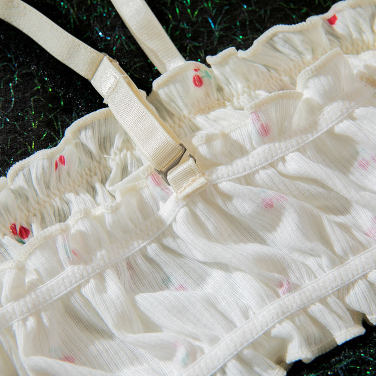 Step into a world of playful charm with this delightful cherry print lingerie set. The soft, comfortable fabric ensures all-day wearability, while the ruffled edges add a touch of whimsy and femininity. The matching bra and panties are designed to enhance your natural curves, making you feel both confident and stylish.