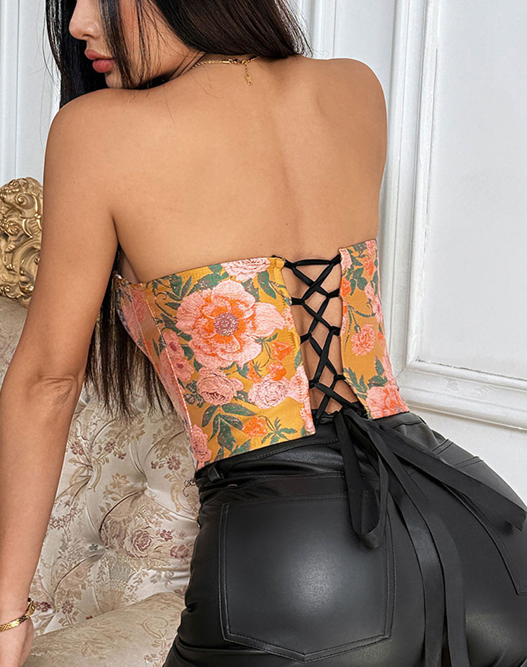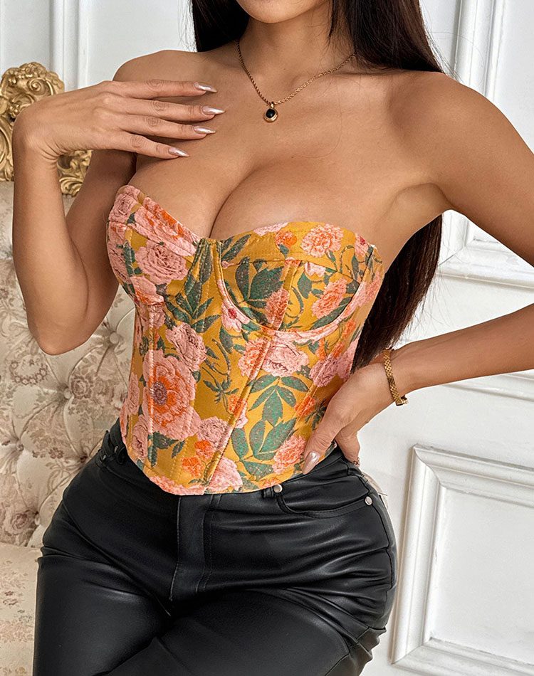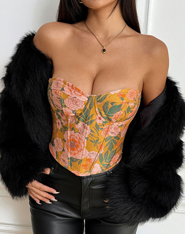 This charming bustier features a vibrant mustard yellow base adorned with a beautiful floral pattern, creating a visually appealing and stylish piece. The structured design accentuates the waistline, offering both support and a flattering silhouette. Perfect for adding a touch of elegance to any outfit, whether you're heading out for a night on the town or attending a special event.