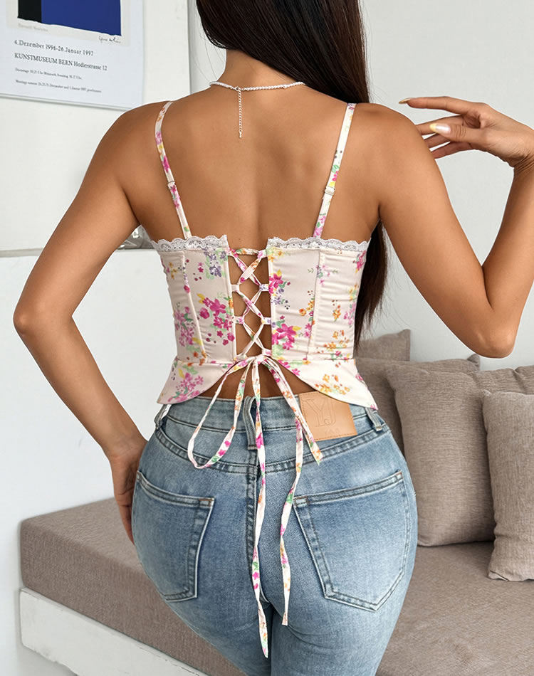 This charming floral corset top features a delightful design with vibrant floral patterns and delicate lace trim that adds a touch of elegance. The fitted silhouette ensure both comfort and style, making it perfect for pairing with jeans or skirts. Ideal for those who want to feel confident and trendy in their everyday wear.