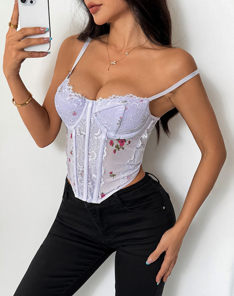 This charming light purple corset features delicate floral embroidery that adds a touch of romance and elegance. The soft lace trim and adjustable lacing create a flattering silhouette, ensuring both comfort and style. Perfect for those who want to feel confident and chic in their everyday wear.