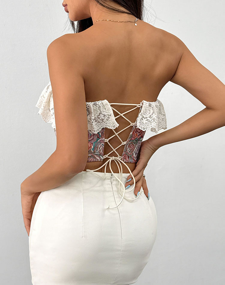 Elevate your style with this enchanting floral fantasy lace corset top. The intricate lace detailing at the top adds a touch of elegance, while the vibrant floral pattern on the lower section brings a burst of color and charm. This unique blend of textures and designs creates a striking piece that is both eye-catching and versatile. Perfect for pairing with high-waisted skirts or pants for a standout look.