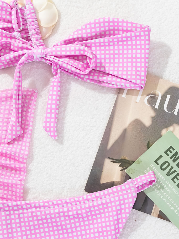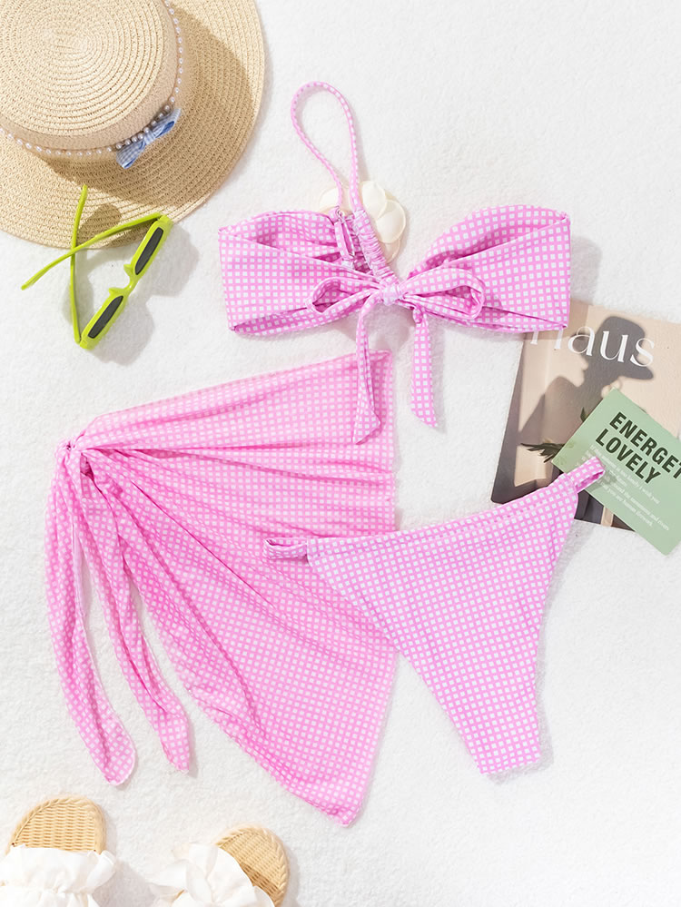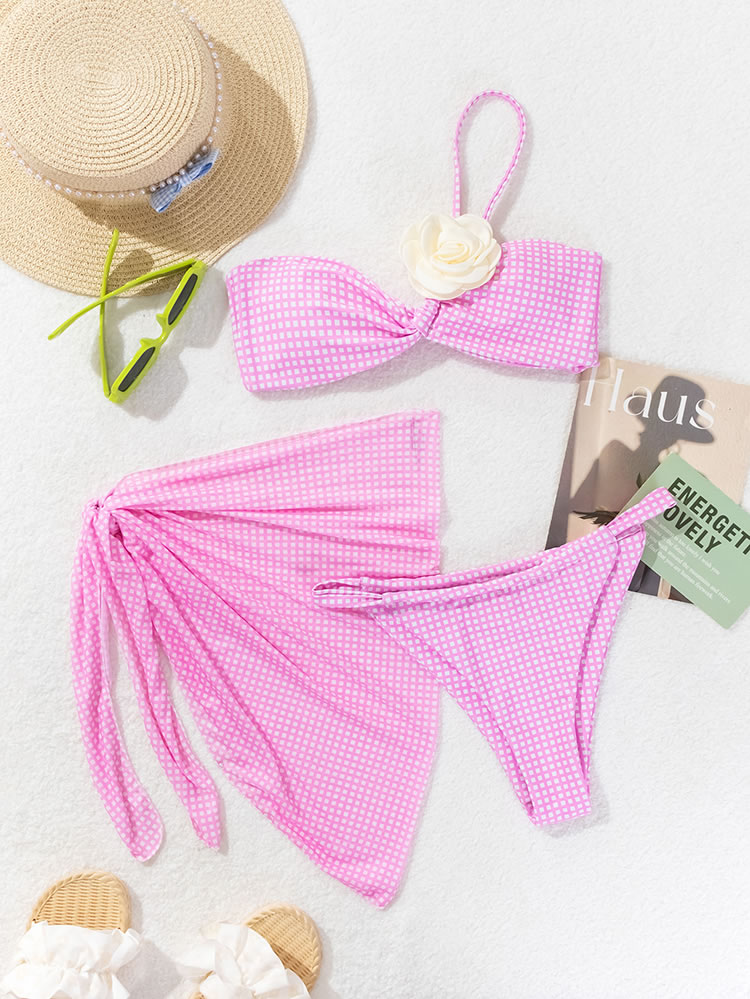Step into summer with this charming pink gingham bikini set. The bandeau top features a stylish tie-back design and is adorned with a white floral accent for added elegance. The matching wrap skirt ties at the side, creating a flirty and feminine silhouette. Perfect for those who want to feel both playful and chic at the beach.