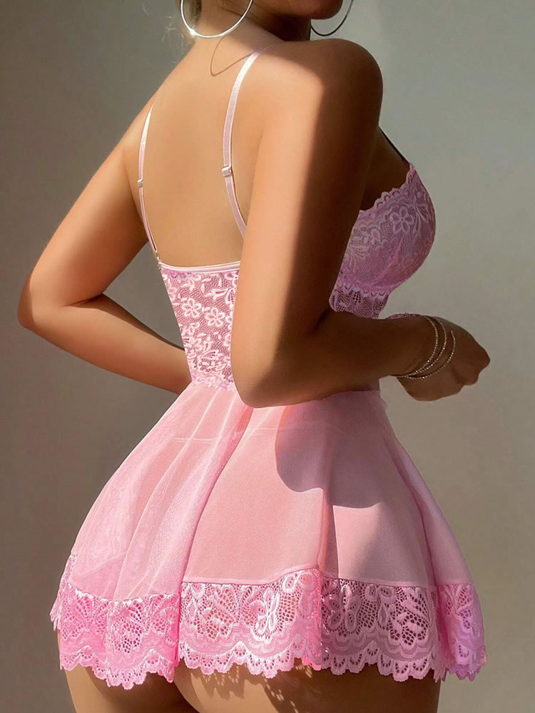 This delightful pink lace chemise is a perfect blend of charm and allure. The bodice features intricate floral lace detailing that accentuates your curves, while the flirty skirt adds a playful touch. The delicate lace trim at the hem enhances its feminine appeal, making it an ideal choice for those who love to feel both confident and stylish.