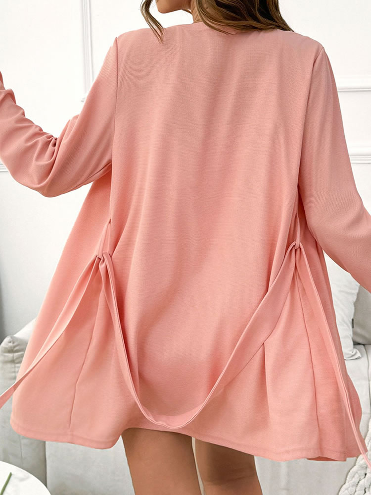 This charming pink loungewear set features a cozy tank top and shorts paired with a stylish belted robe. The soft, breathable fabric ensures ultimate comfort, making it perfect for relaxing at home. The elegant bow tie adds a touch of femininity, enhancing the overall look.