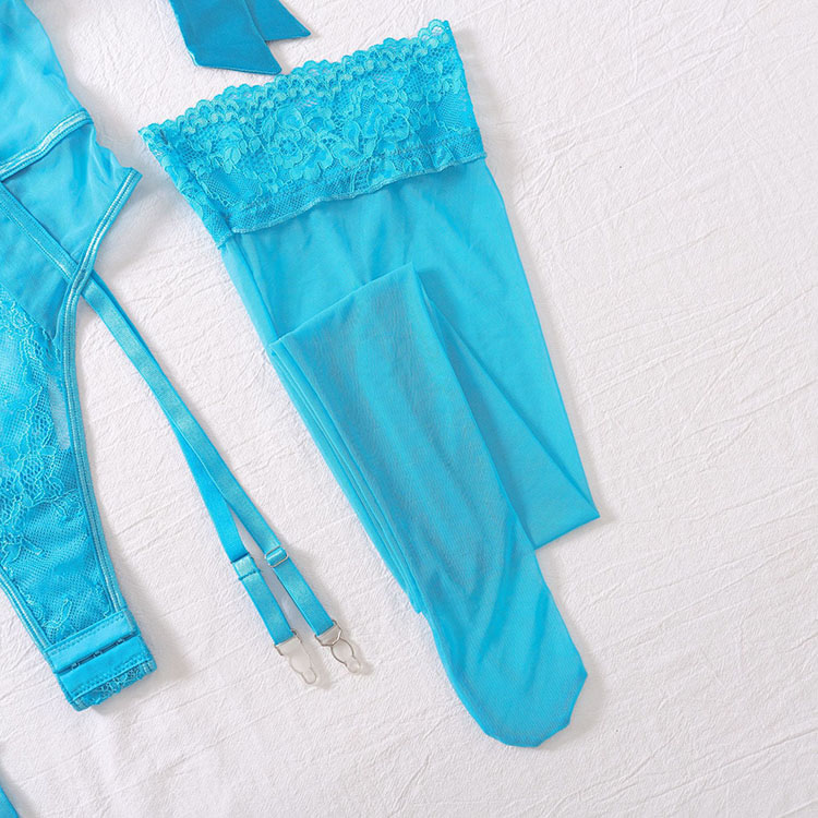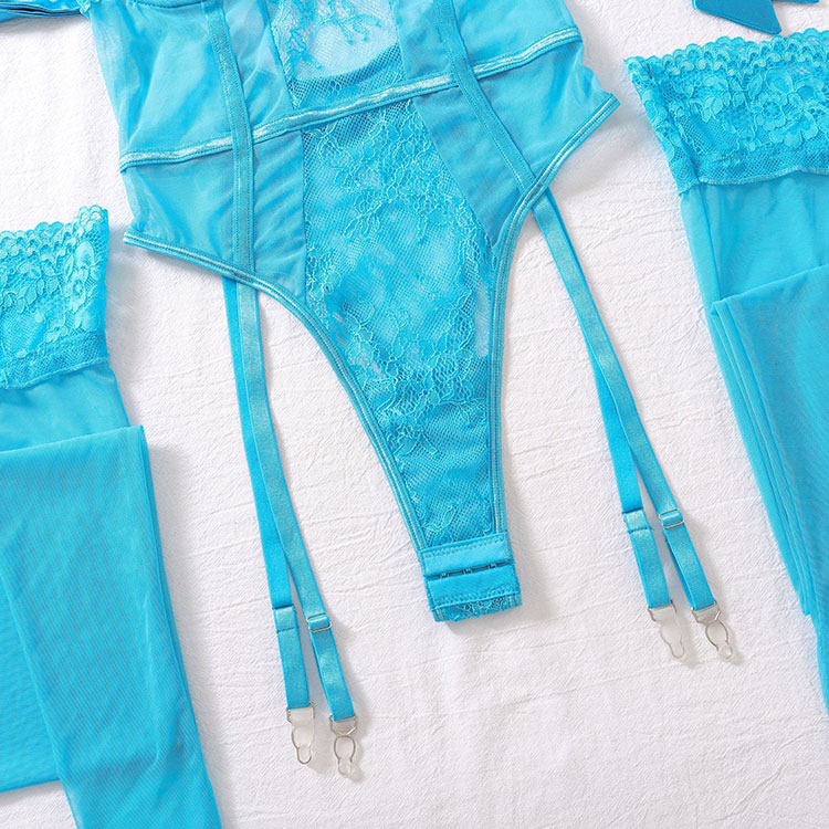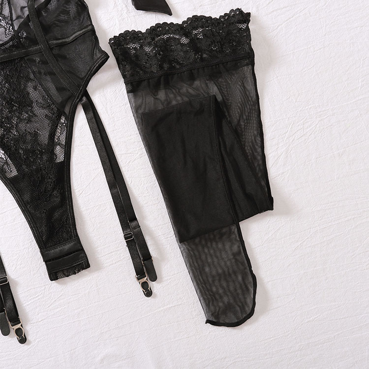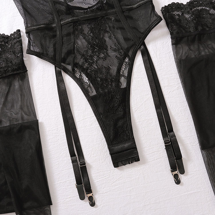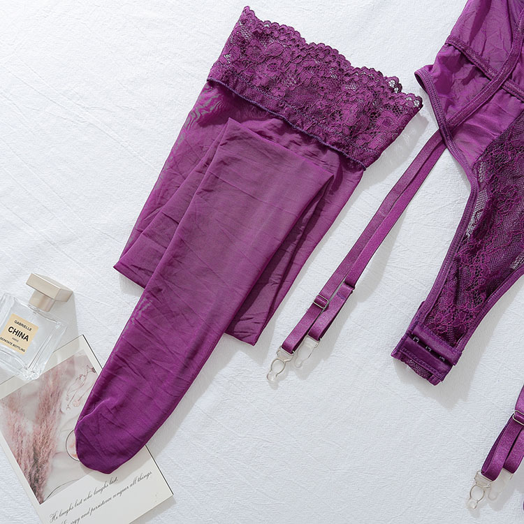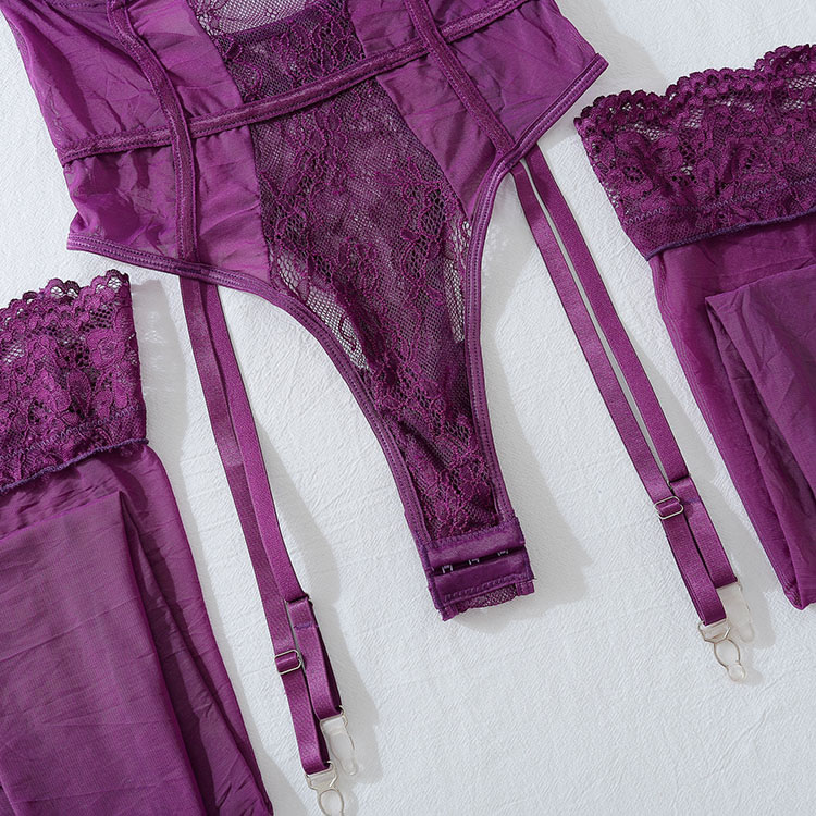 This seductive lingerie set features a deep V-neck bra with intricate purple lace detailing and sheer mesh inserts, paired with high-waisted bottoms that include garter straps for stockings. The combination of rich purple lace and sheer mesh adds a touch of daring elegance.