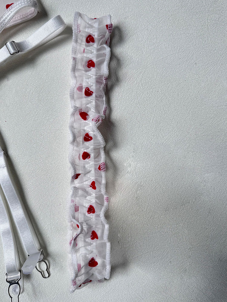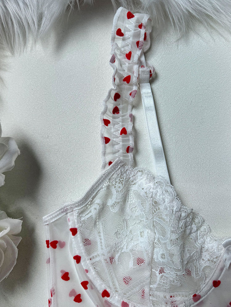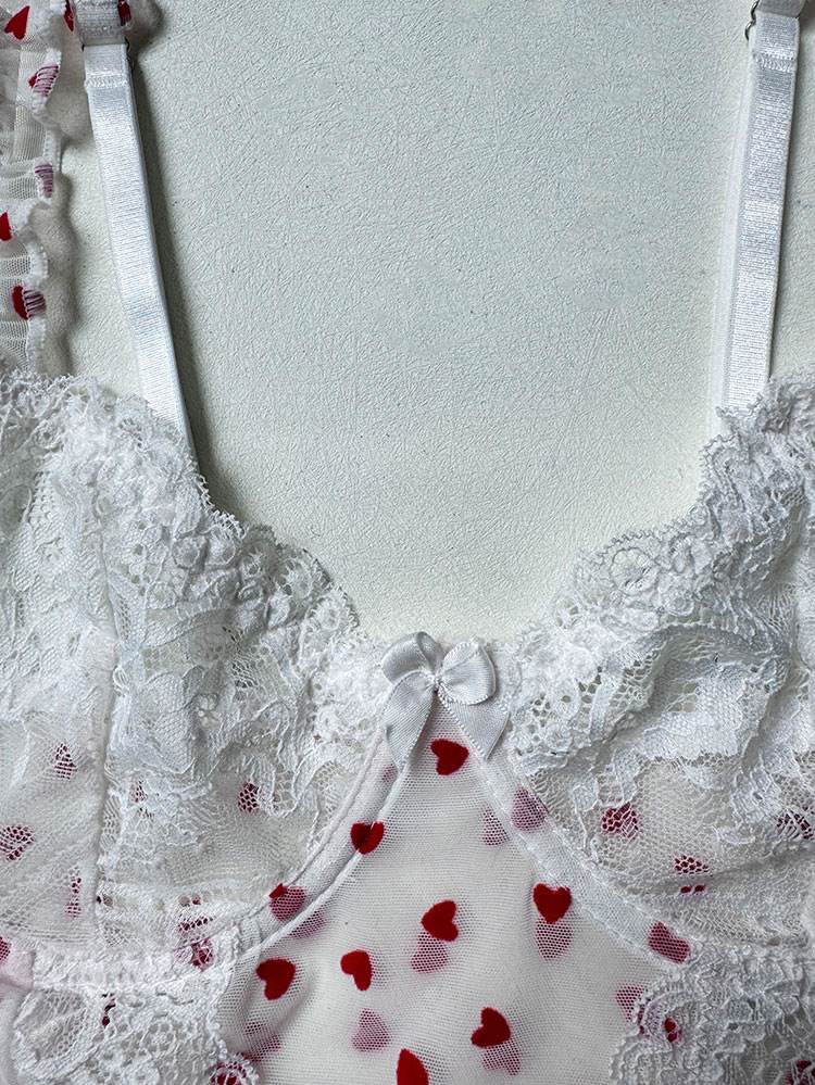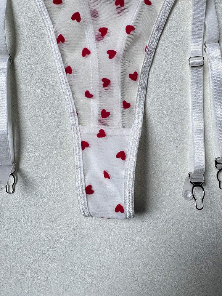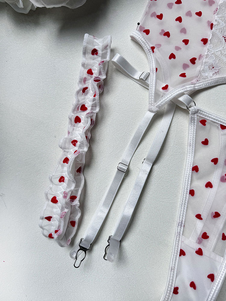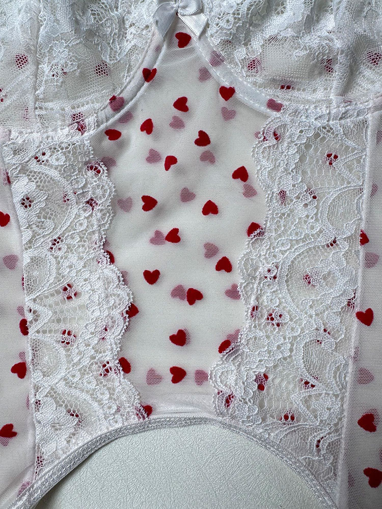 This striking chemises set combines bold lace with vibrant red heart accents for a look that is both edgy and alluring. The intricate lace detailing adds a touch of elegance, while the garter straps ensure your stockings stay in place. Perfect for those who want to make a statement and feel confident in their lingerie.