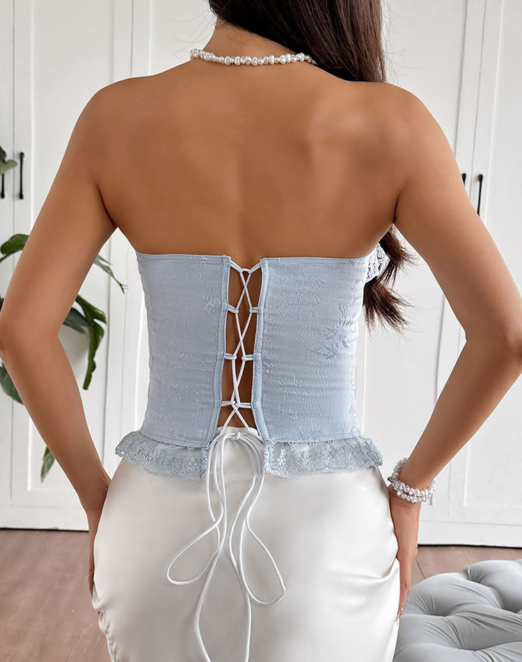 Embrace a touch of vintage charm with this beautifully designed corset. Featuring delicate lace trim and a charming bow at the neckline, it offers a perfect blend of style and comfort. The structured ensures a flattering silhouette, making it an ideal choice for special occasions or as a standout piece in your wardrobe. Pair it with a sleek skirt or dress to create a timeless look.