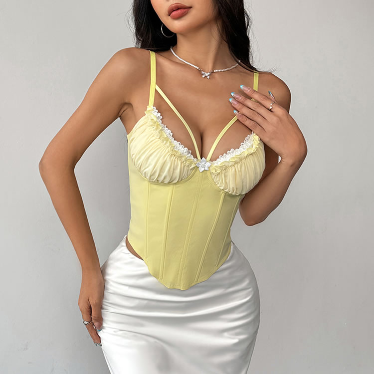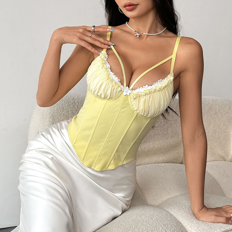 Elevate your style with this chic lemon yellow bustier, featuring a sweetheart neckline adorned with delicate lace trim and a central floral accent. The corset-style design provides a flattering fit that enhances your curves, while the thin spaghetti straps offer a customizable fit. Perfect for both intimate moments and special occasions, this bustier adds a touch of sophistication to any outfit.