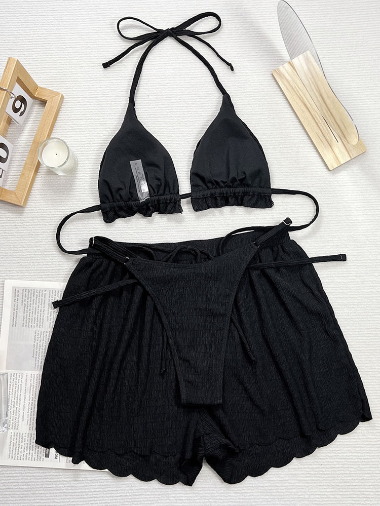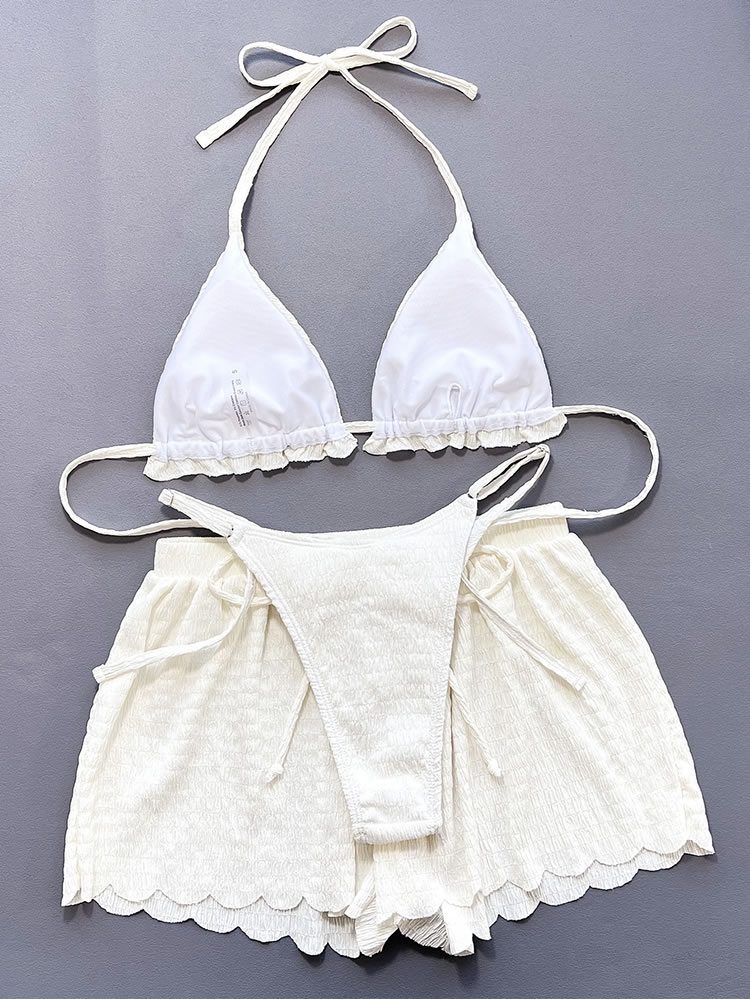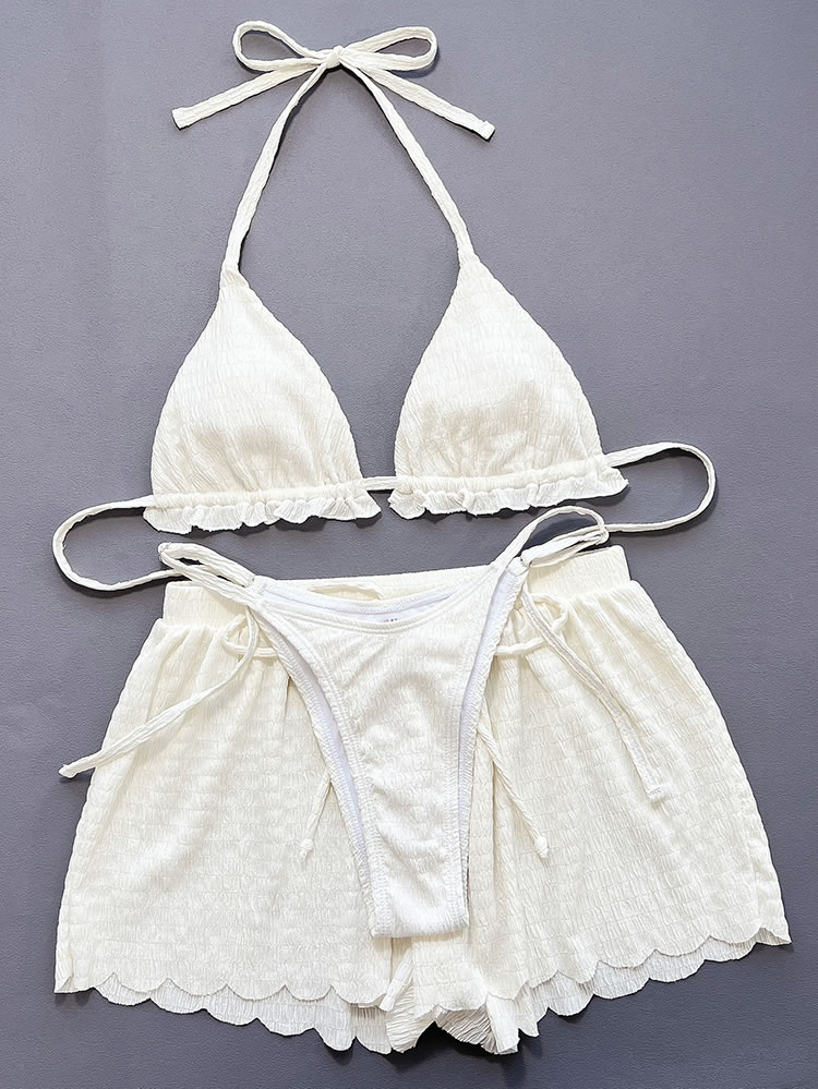 Step into summer with this chic white smocked bikini set. The top features a flattering V-neck design with delicate ruffles, providing both support and style. The matching shorts offer a comfortable fit with an adjustable drawstring waist, making it perfect for relaxing by the pool or strolling along the beach.