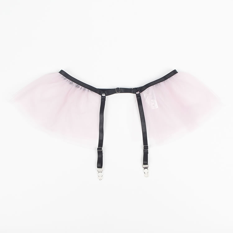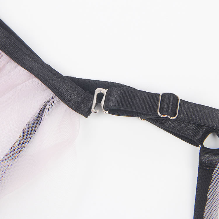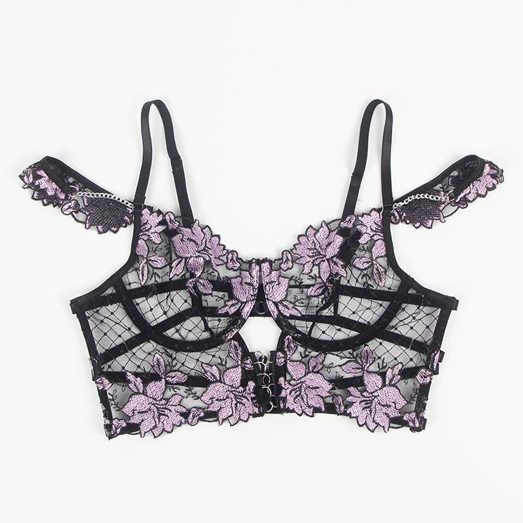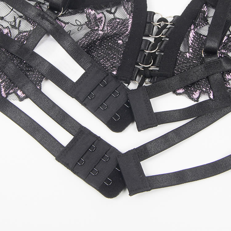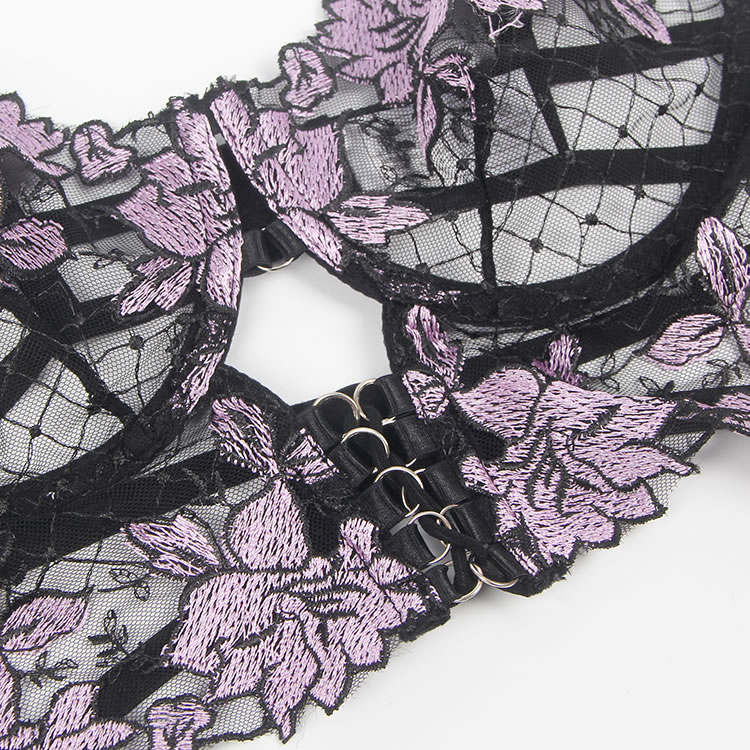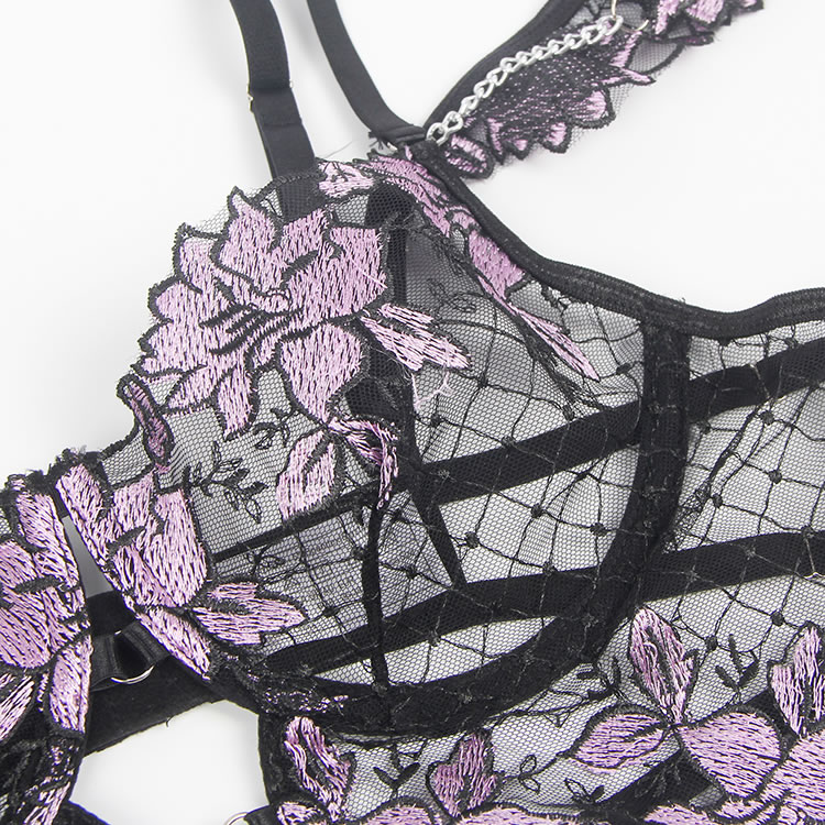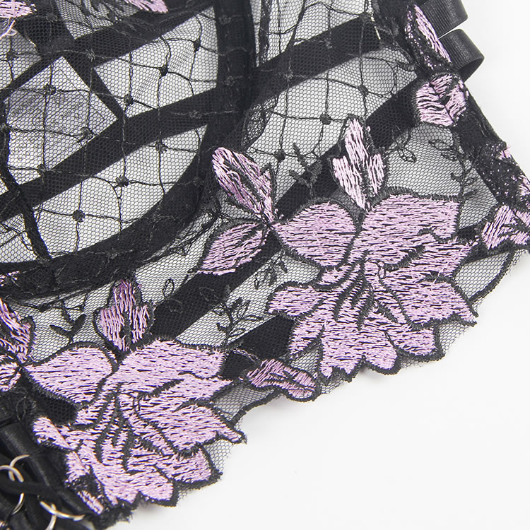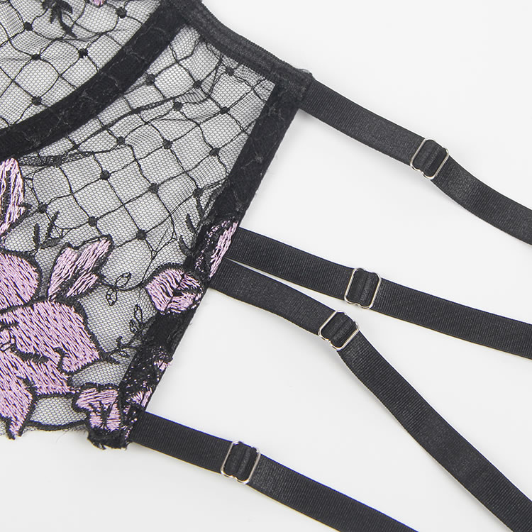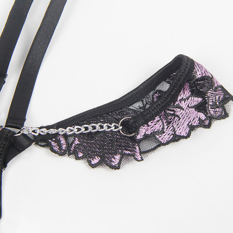 Tease the lap of sexy in this lingerie set featuring a black and purple lace bra with sheer underwire cups, adjustable spaghetti straps, a front keyhole opening, a longline underbust band with a hook and eye back closure, a matching high waisted garter belt, a hook back closure, adjustable garter straps, adjustable leg garters, and a matching panty with a thong cut back.
