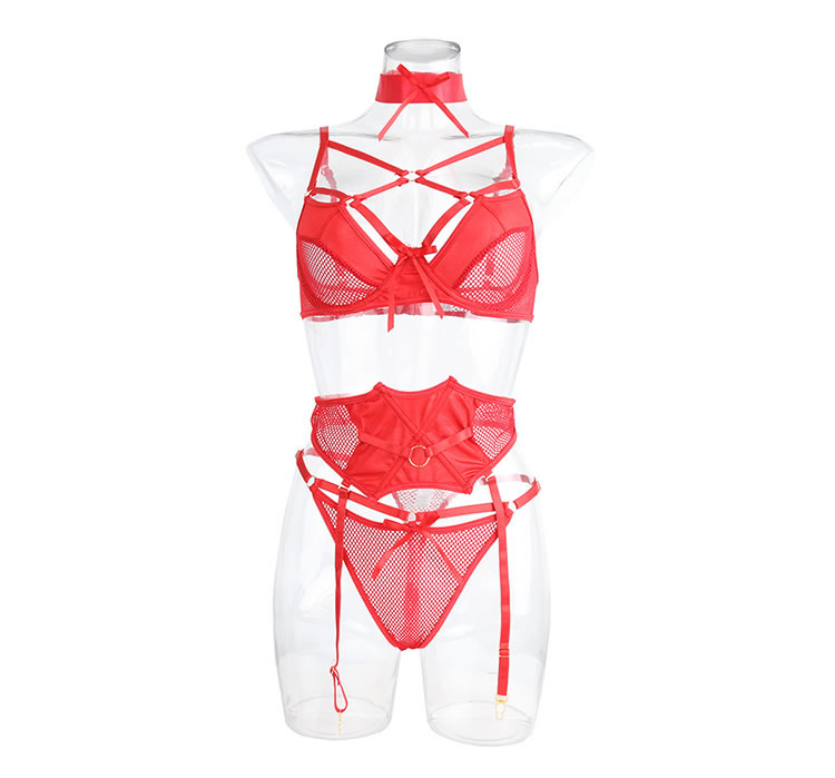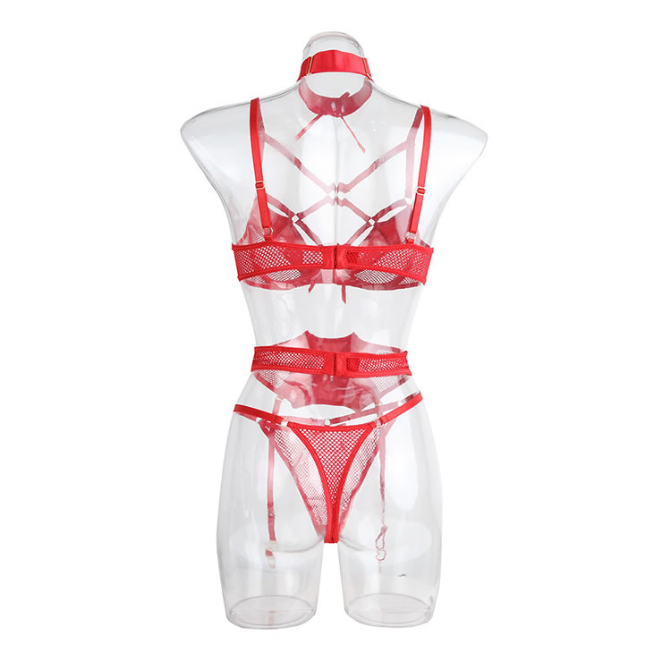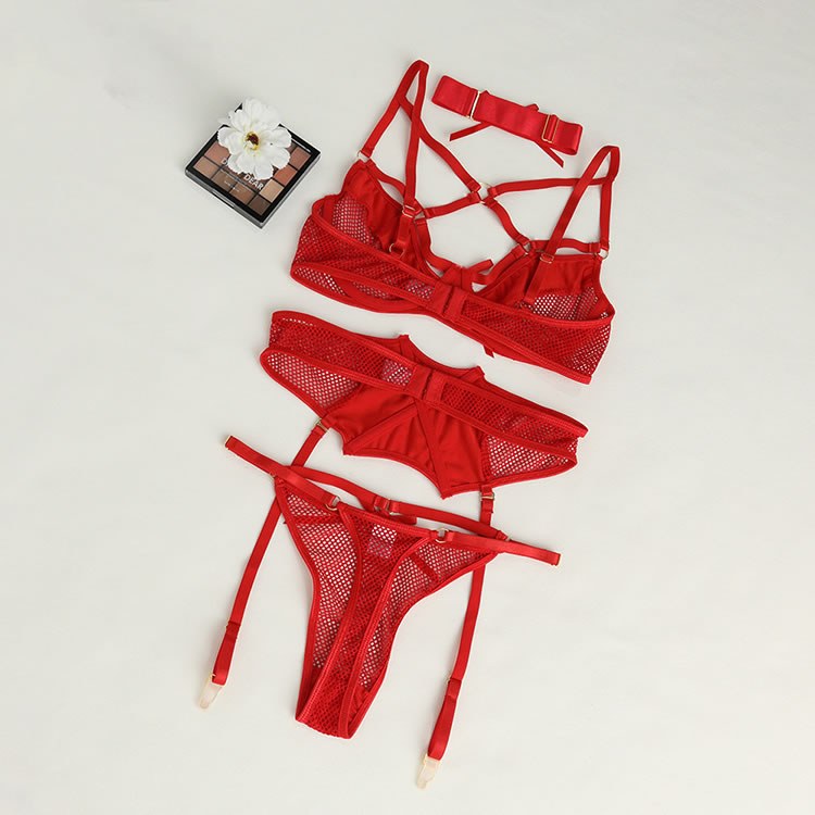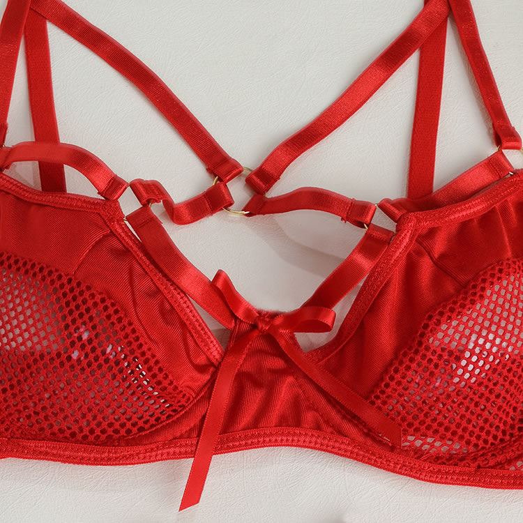 Classic Sexy Mesh O-ring Detail Crisscross Front Garter Thong Lingerie Set