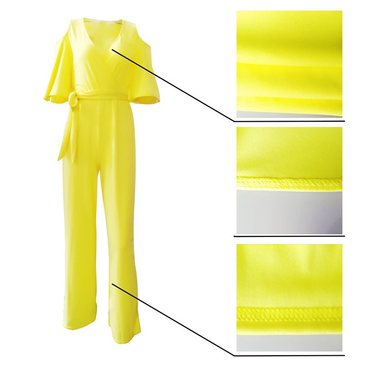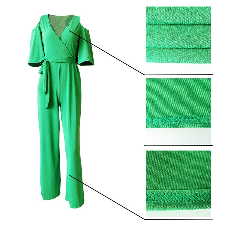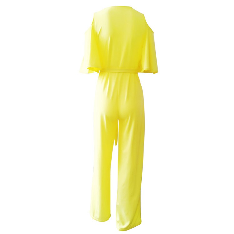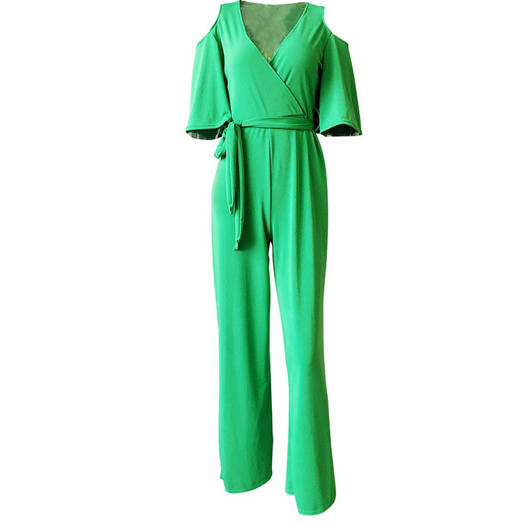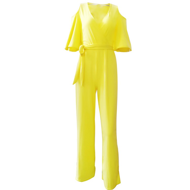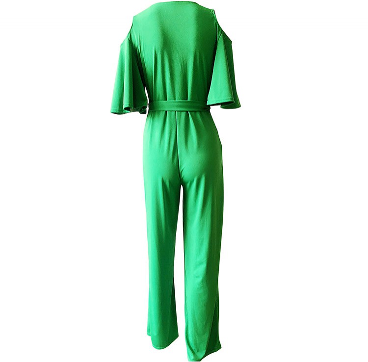A jumpsuit featuring short sleeves, open-shoulder design, attached self-tie belt, and surplice neckline.