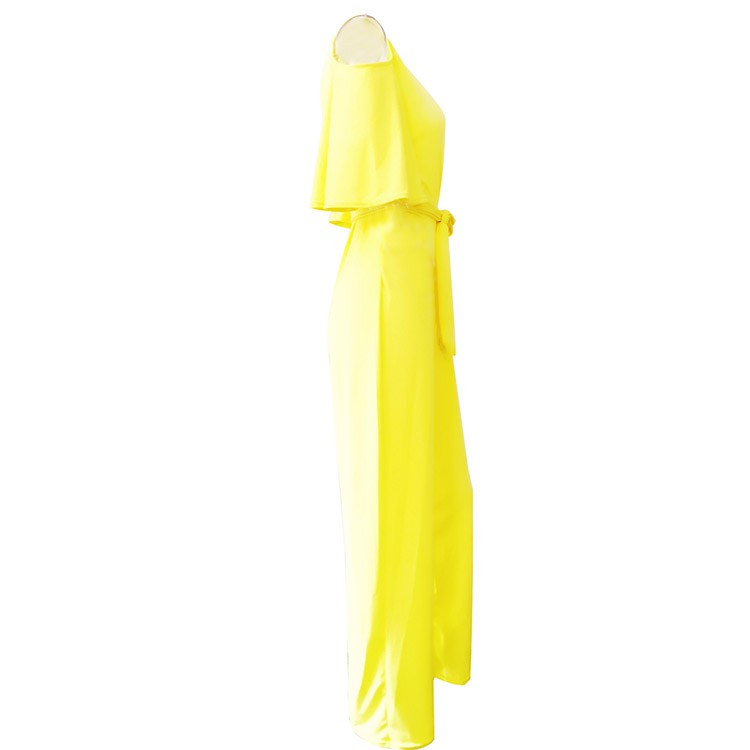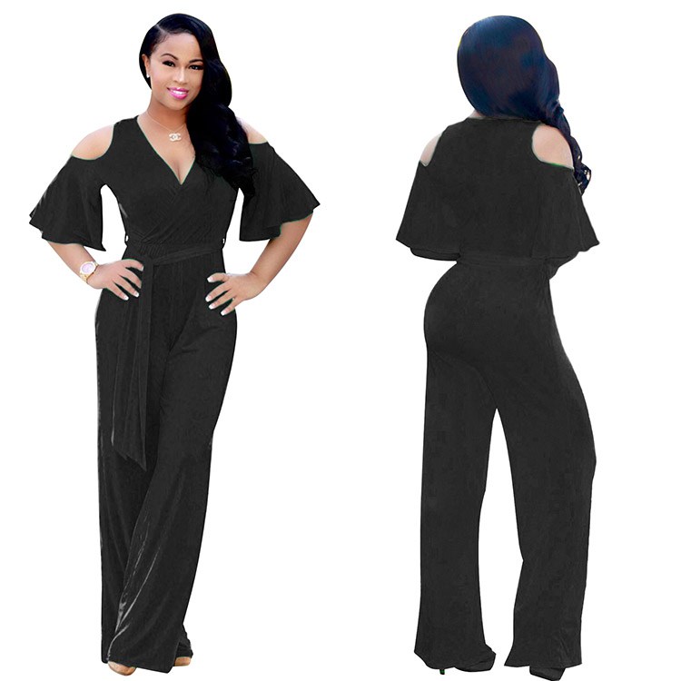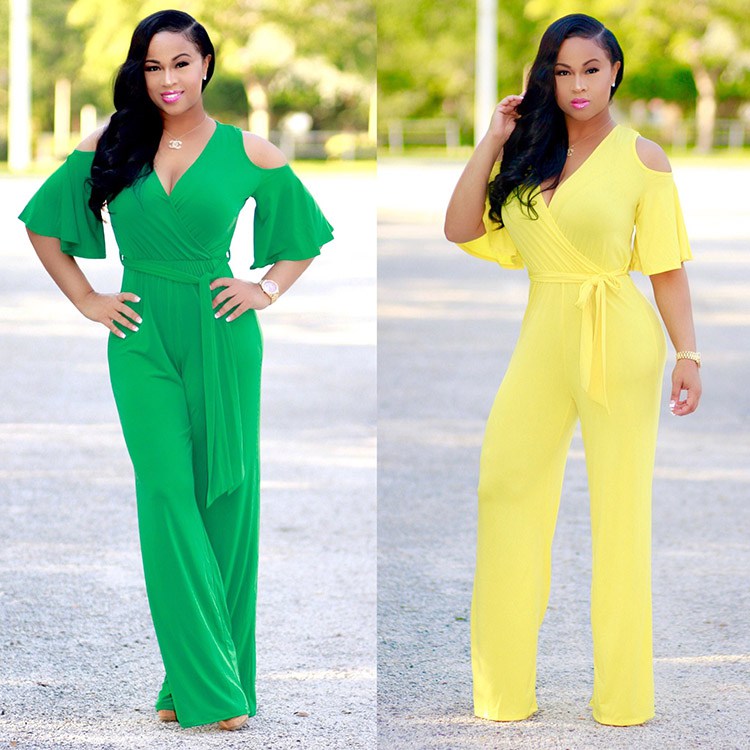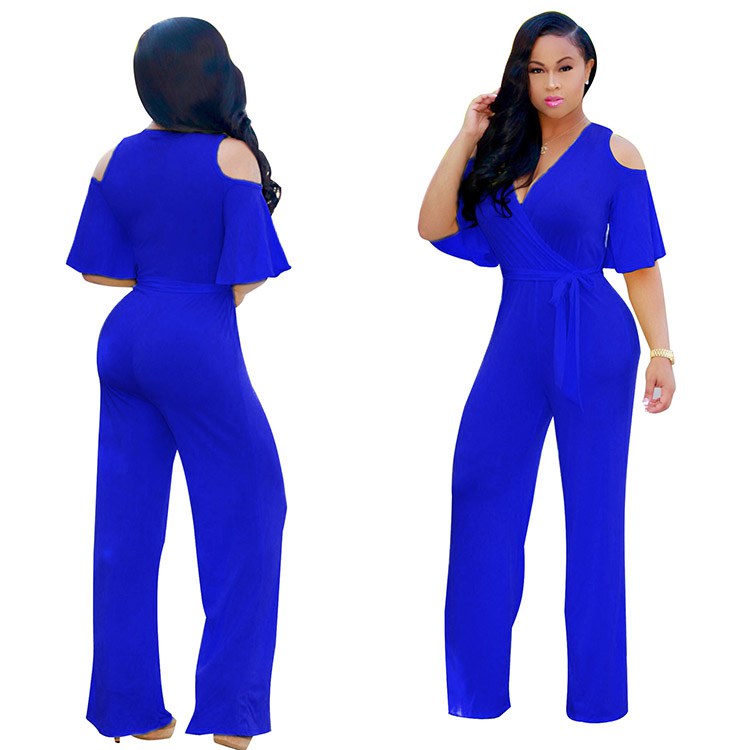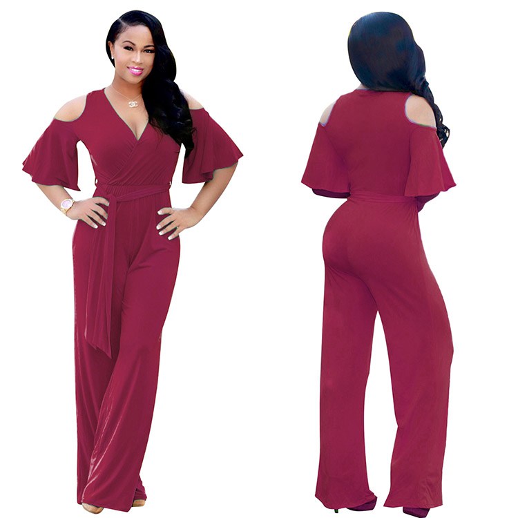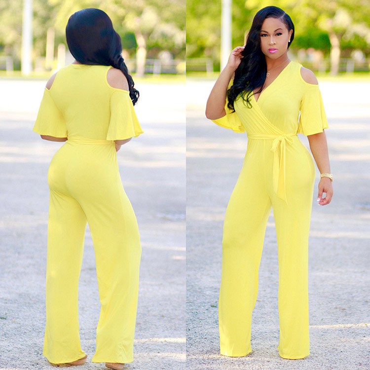 A jumpsuit featuring short sleeves, open-shoulder design, attached self-tie belt, and surplice neckline.