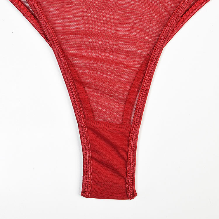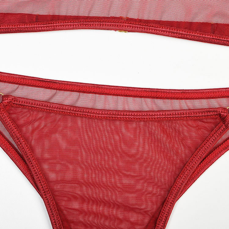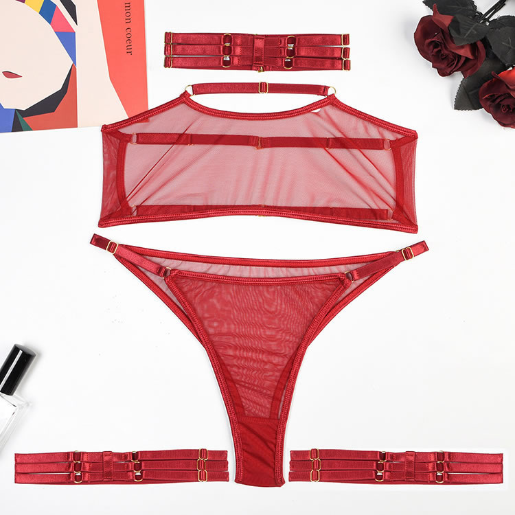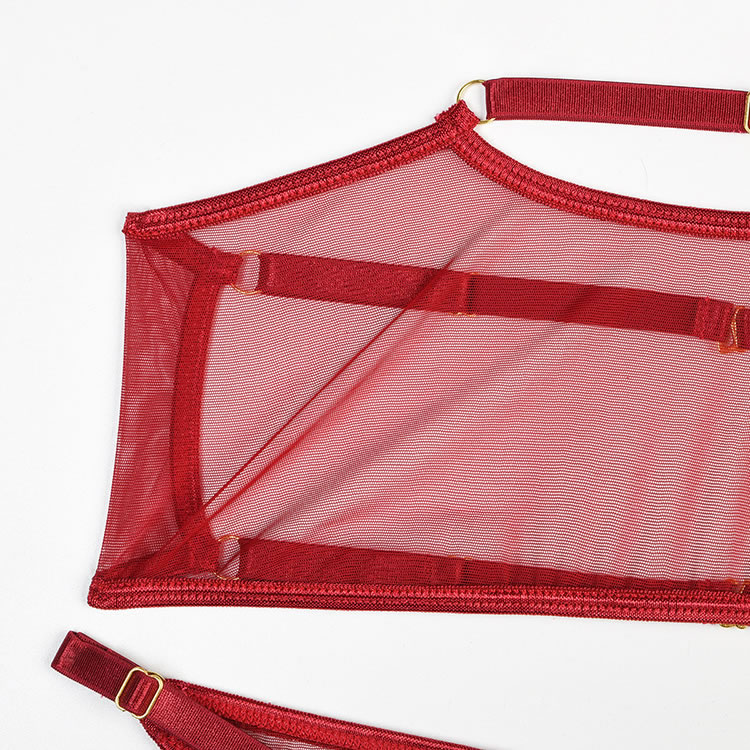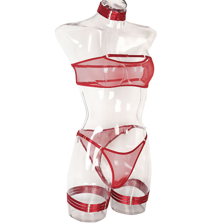 Call the shots in the evocative bralette set featuring sheer mesh cups, a hook back closure, and a matching panty, wraparound leg garters, and a matching choker.