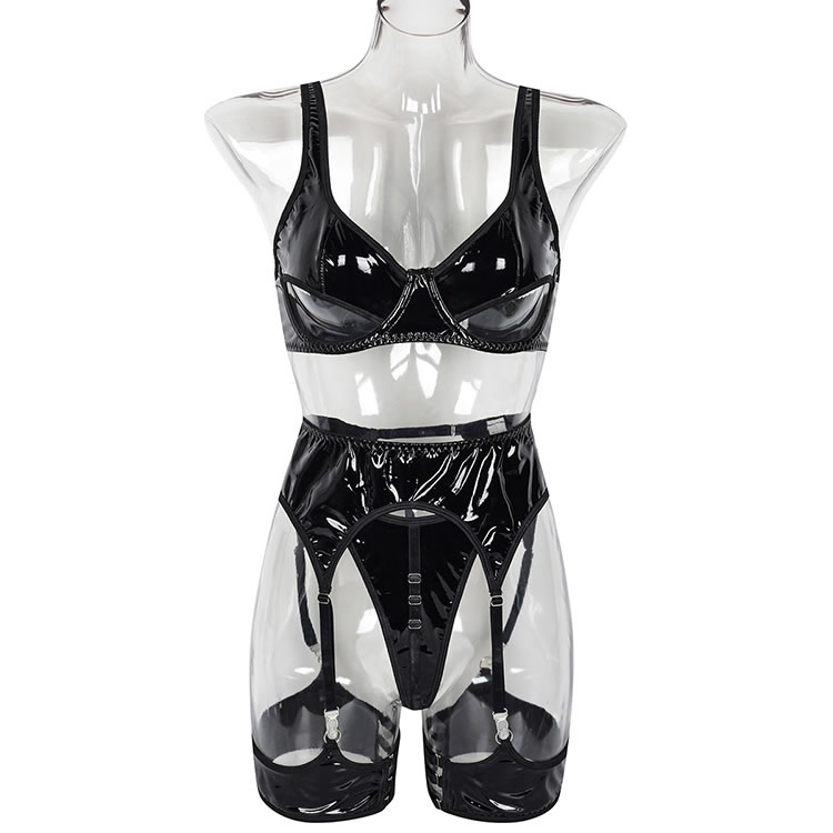 Unleash your inner baddie in this sexy vinyl bra set featuring underwire cups with peek-a-boo cut-outs, adjustable spaghetti straps, a hook and eye back closure, a garter belt with a hook back closure, garter straps, wraparound leg garters, and a matching thong.