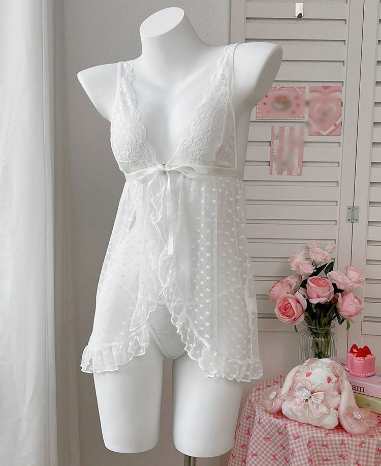 This sweet and flirty lingerie brings a playful touch to your nightwear with its delicate lace trim and sheer mesh overlay. The deep V-neckline detail add a hint of charm, while the ruffled hem gives it a soft, feminine flair. Designed for those who love a cute yet sexy look, this set is perfect for lounging, romantic evenings, or adding a whimsical vibe to your intimate moments.