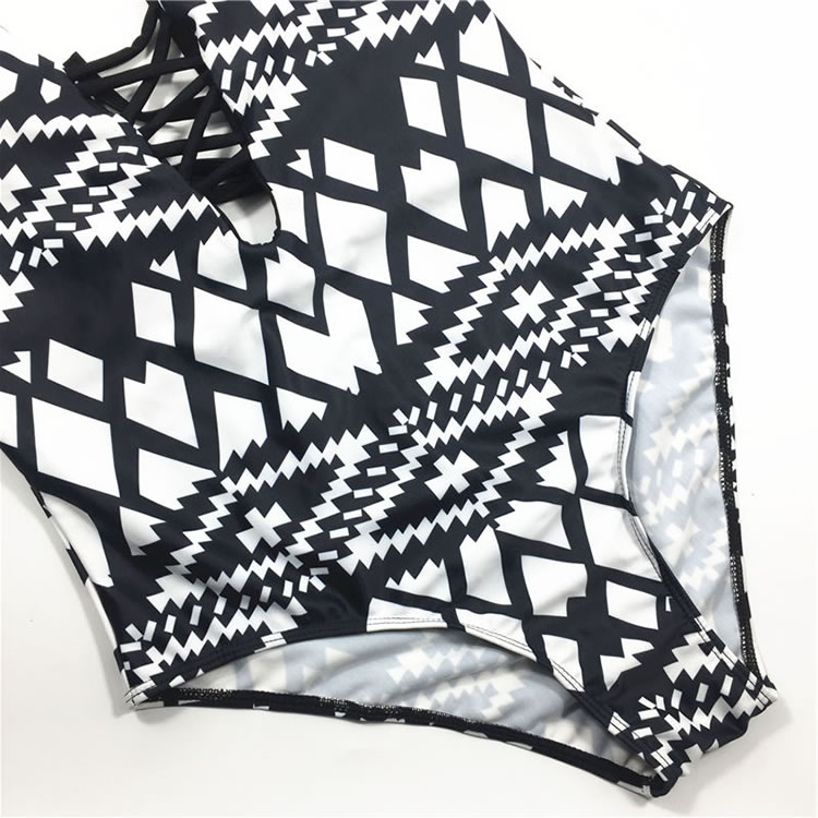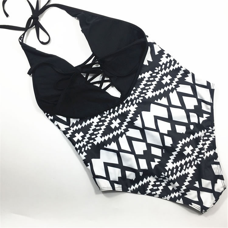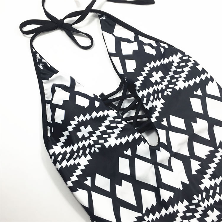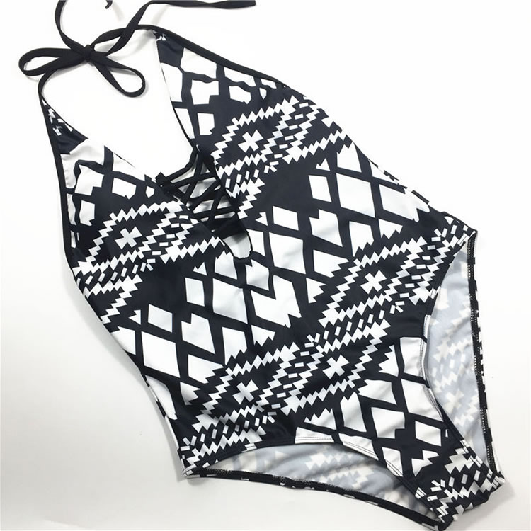 You'll be prepped for a day of fun in the sun in this cute swimsuit featuring a plunging neckline with criss-cross strappy detailing, a black and white geometric design, halter straps, a tie back closure, a back keyhole opening, and a cheeky cut back.