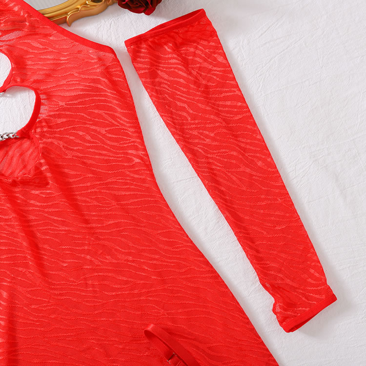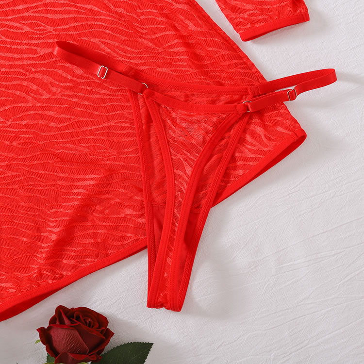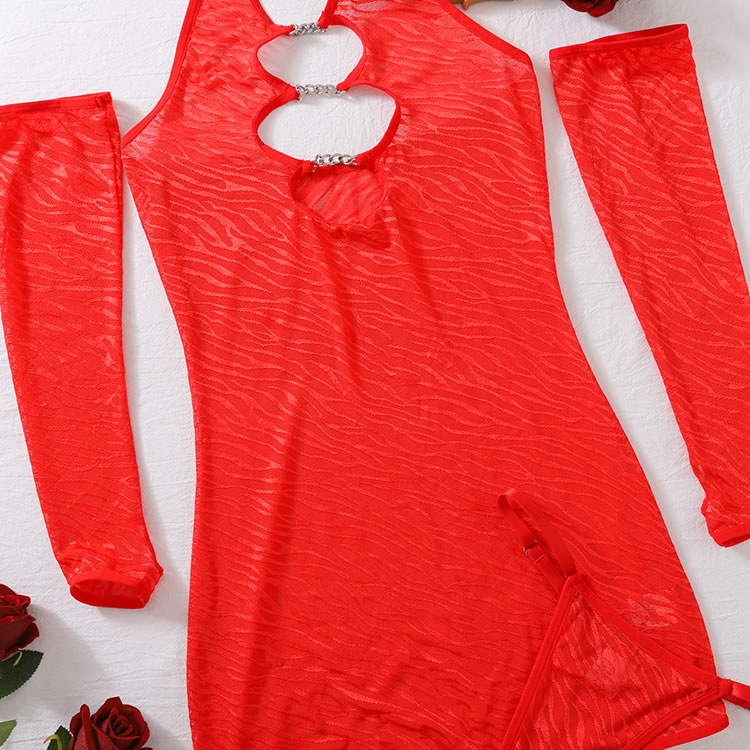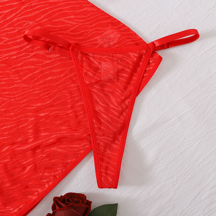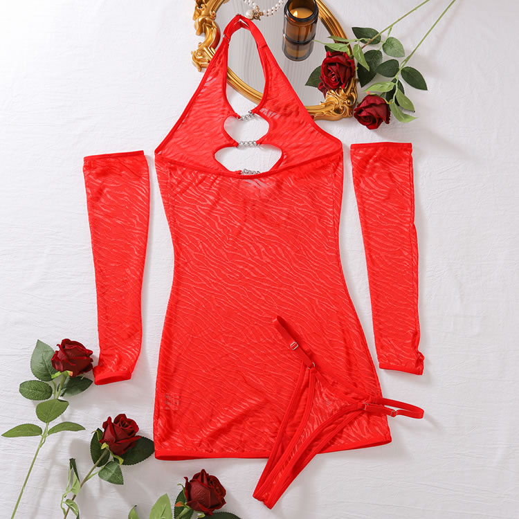 Dare to go somewhere new in this sexy chemise featuring sheer mesh cups, halter straps, a sheer mesh bodice, gloves, and a matching thong