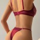 This striking red lingerie set features a sheer mesh base with intricate floral embroidery that adds a romantic touch to its bold design. The underwire bra offers structured support with thin straps and a secure back clasp, while the matching thong delivers a sleek, minimalist silhouette. It’s perfect for intimate moments or making a statement at home.