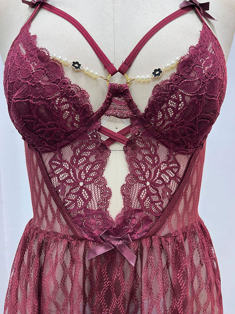 This elegant deep red lingerie dress combines boldness with romance in a striking design. Featuring a plunging sweetheart neckline with delicate bow ties and a beaded accent at the bust, it draws attention with subtle flair. The sheer mesh skirt flows gracefully with a high slit, offering movement and allure, while the ruffled hem adds soft texture. Designed with thin adjustable straps and a flattering fit, it’s perfect for intimate moments or when you want to feel both powerful and graceful.