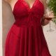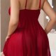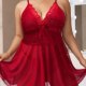 This plus-size red chemise features a lace-trimmed bustier top with a deep V-neckline and central bow detail for a flattering silhouette. The thin adjustable straps offer a customizable fit, while the sheer mesh skirt flows gently over the hips. Designed to be both comfortable and eye-catching, this piece is perfect for wearing at home or as a bold statement under clothing.