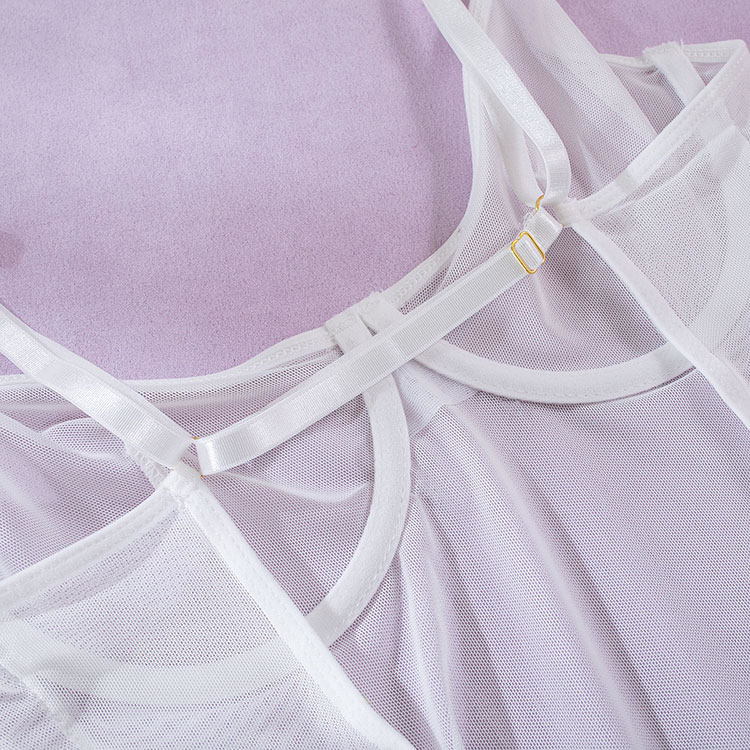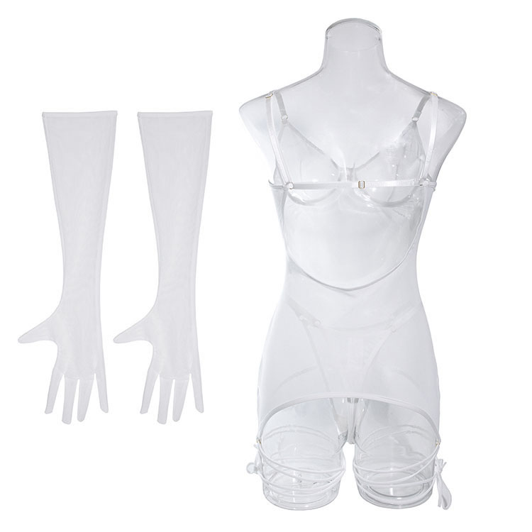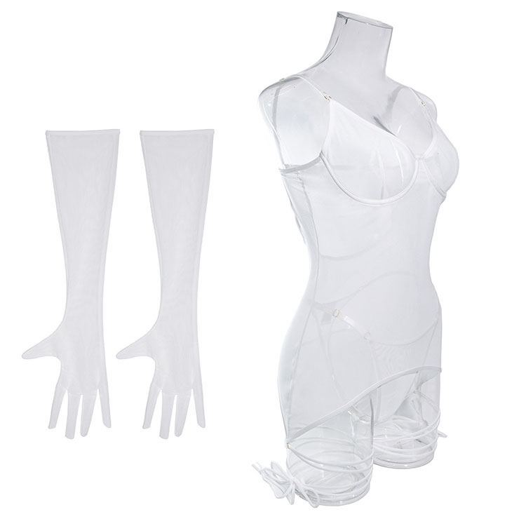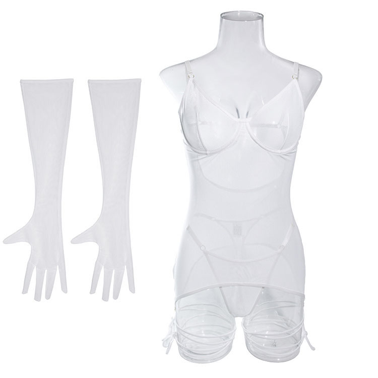 She might look sweet, but she's oh so daring in this sultry chemise set featuring sheer mesh underwire cups, adjustable spaghetti straps, a sheer mesh bodice, garter leg wraps, long gloves, and a matching thong panty.