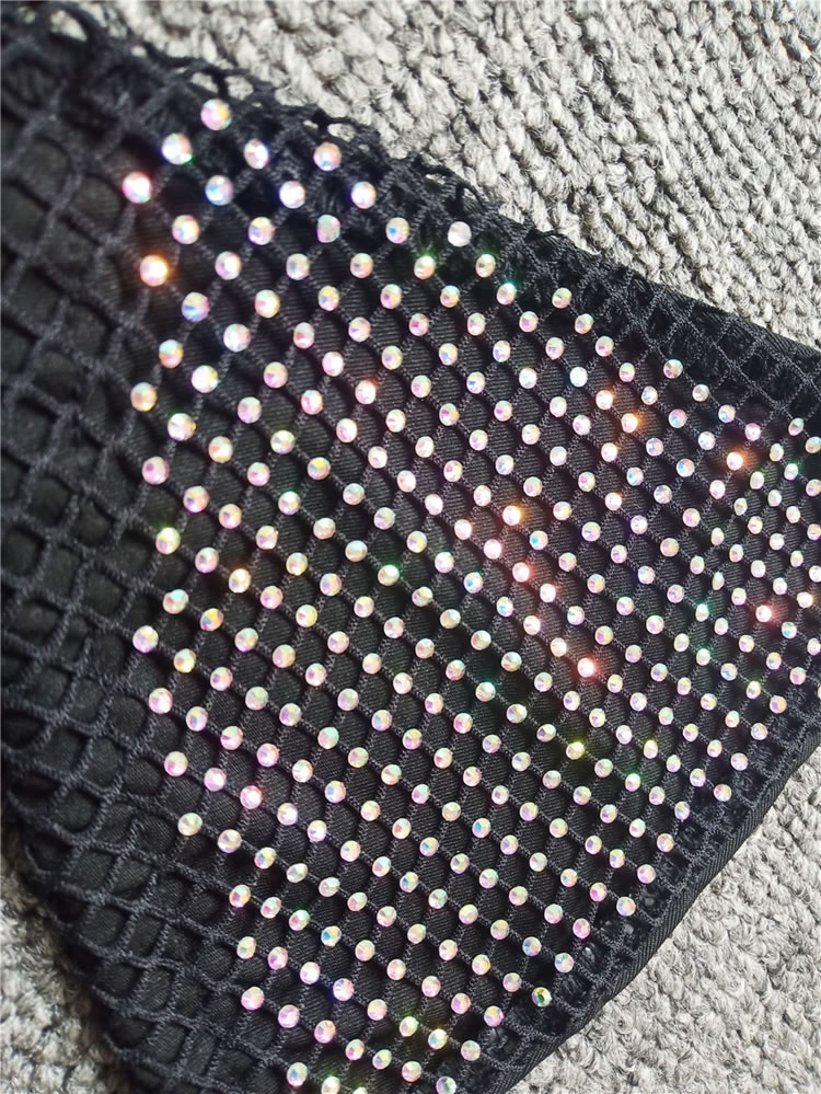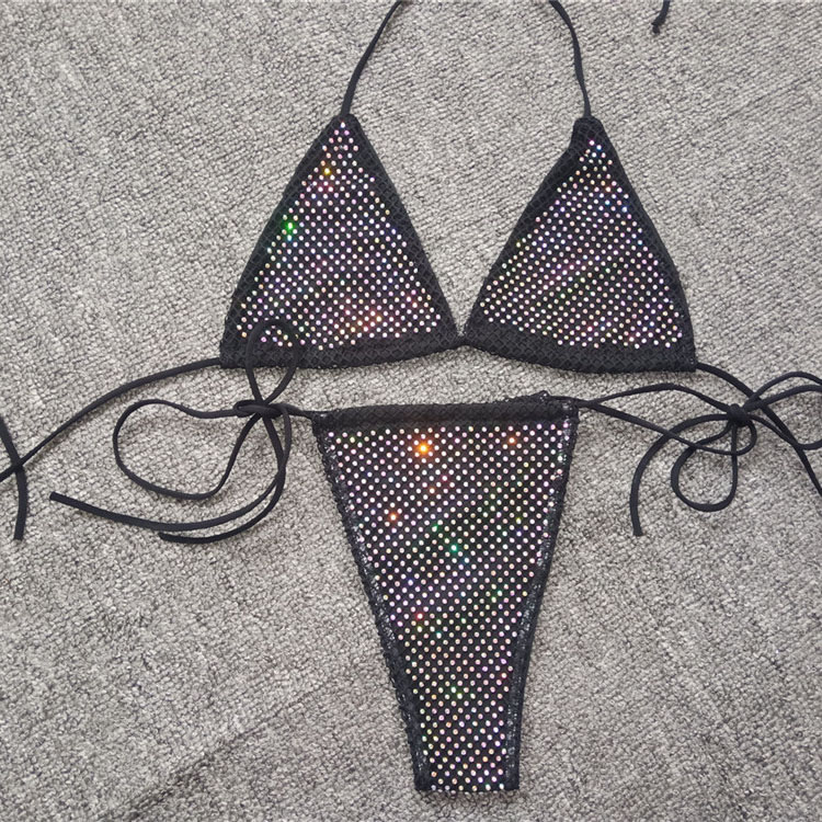 You'll dazzle your partner in this sexy bra set featuring rhinestone triangle cups, halter straps, a string tie back closure, and a matching high cut thong panty.