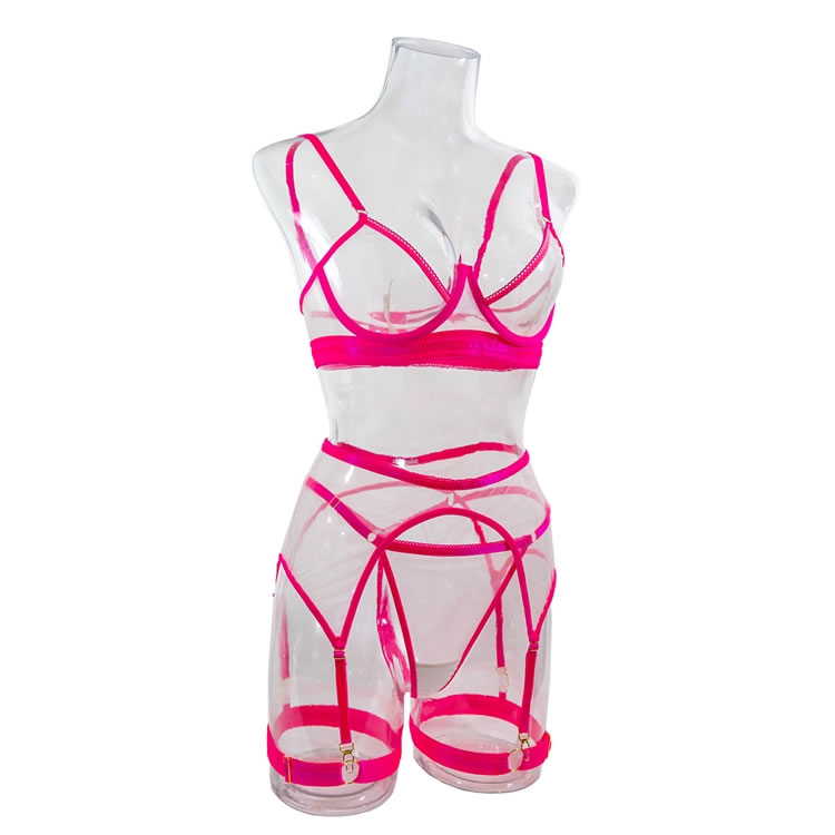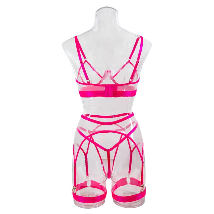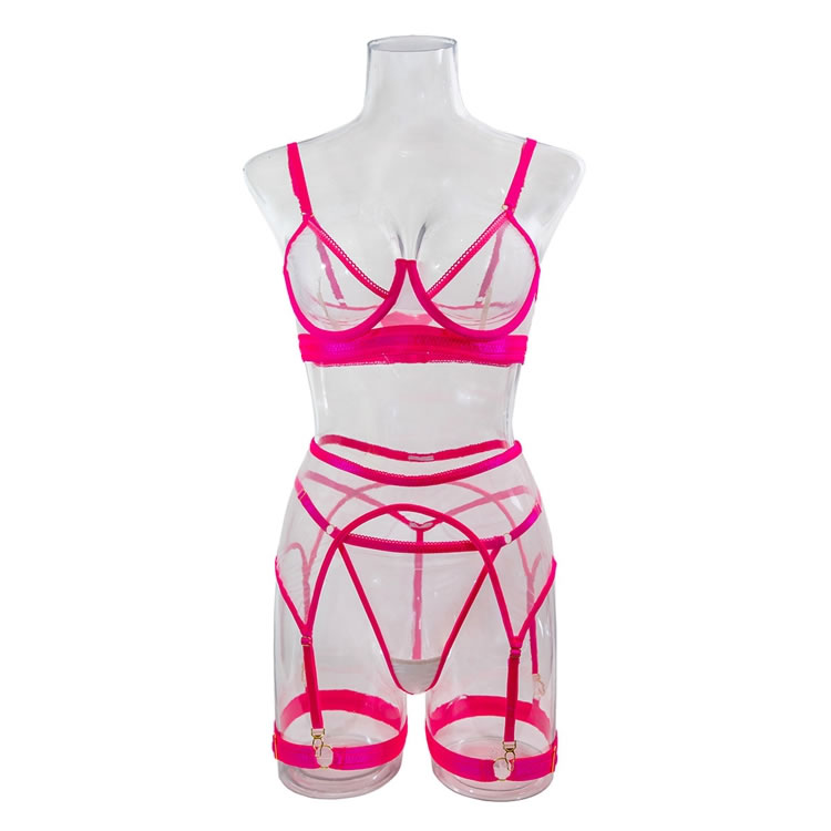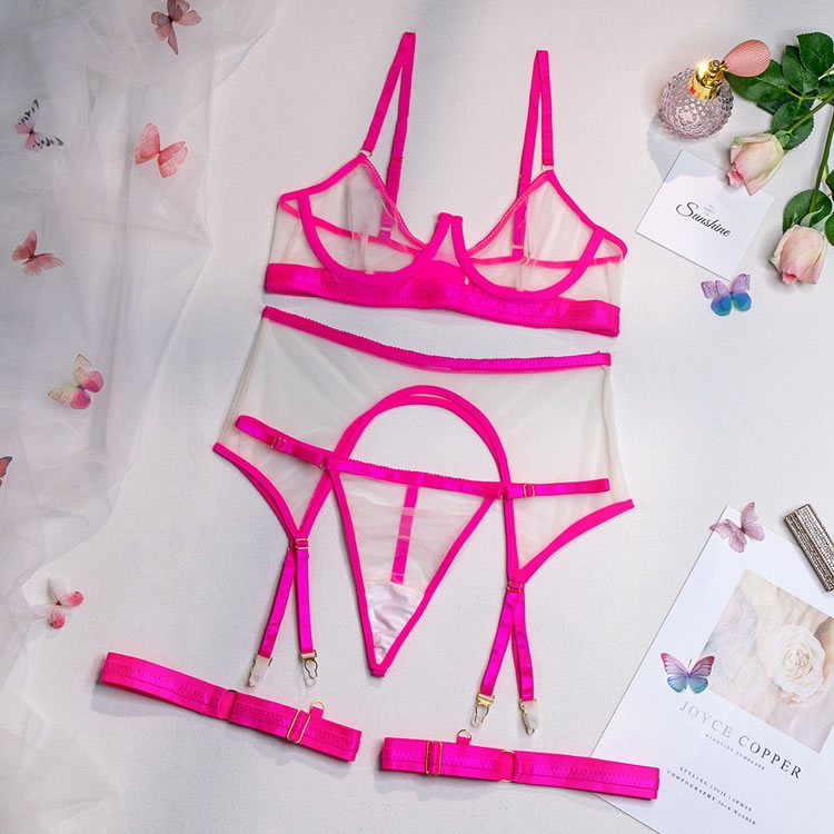 Make a mark on your babe in this stunning bra set featuring sheer mesh underwire cups, adjustable spaghetti straps, an elastic underbust band with a hook and eye back closure, a matching strappy garter belt with adjustable garter straps, and a matching thong panty.