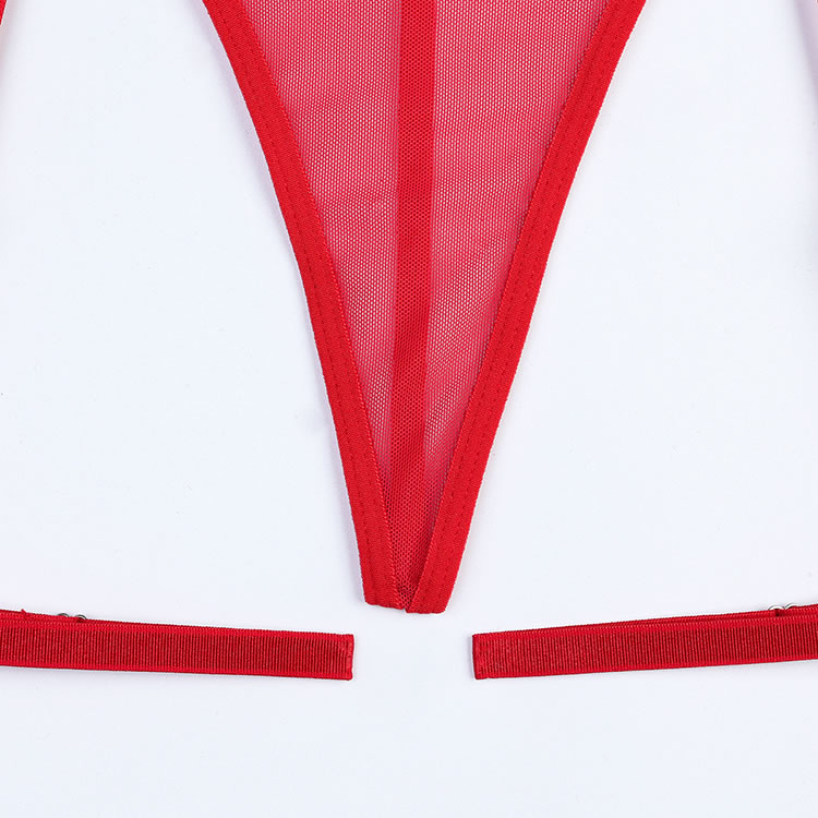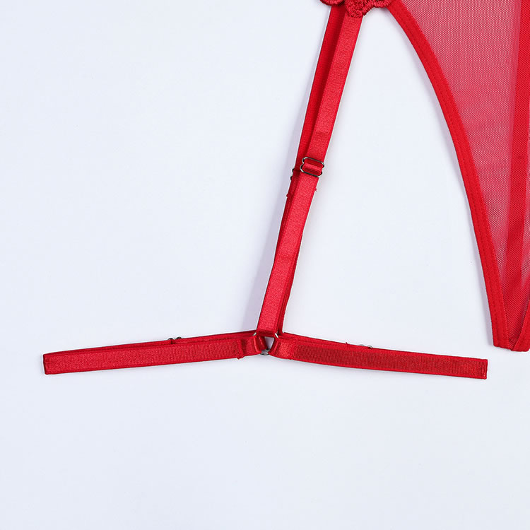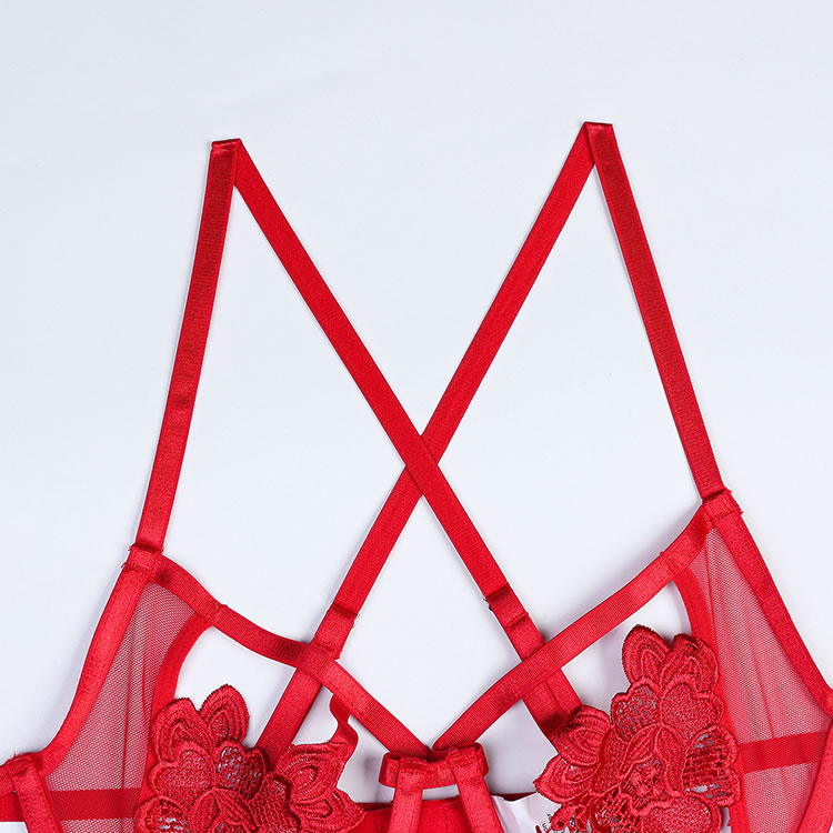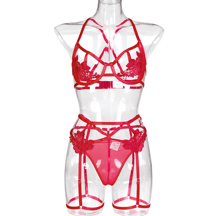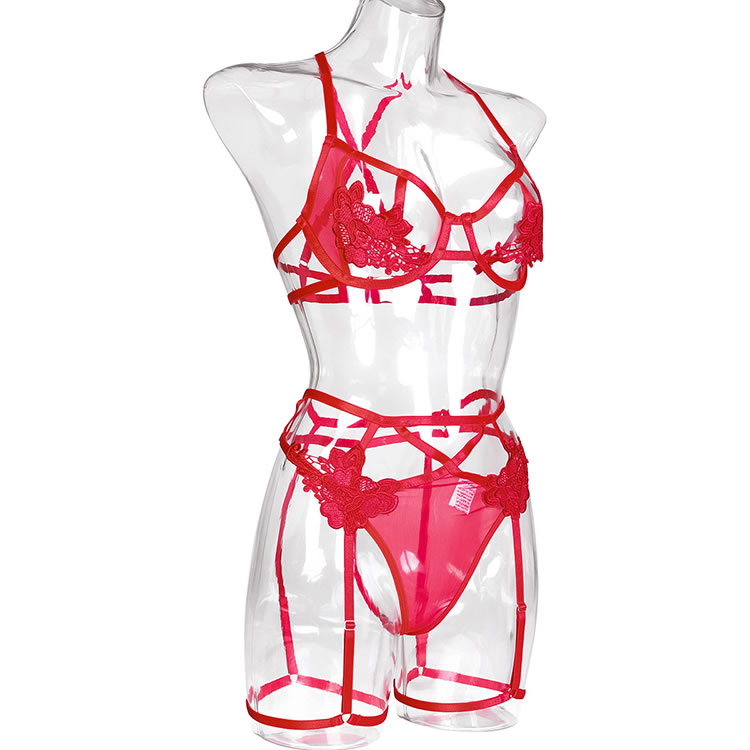 Bring out your sweetie's wild side in this stunning lace bra set featuring open strappy cups with lace flower appliques, adjustable spaghetti straps, a hook and eye back closure, and a matching panty with adjustable garter straps, wraparound leg garters, and a thong cut back.