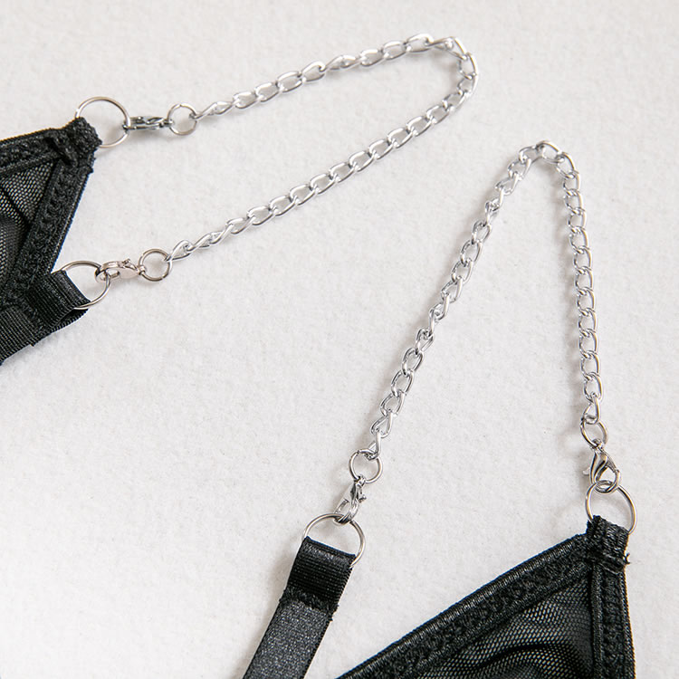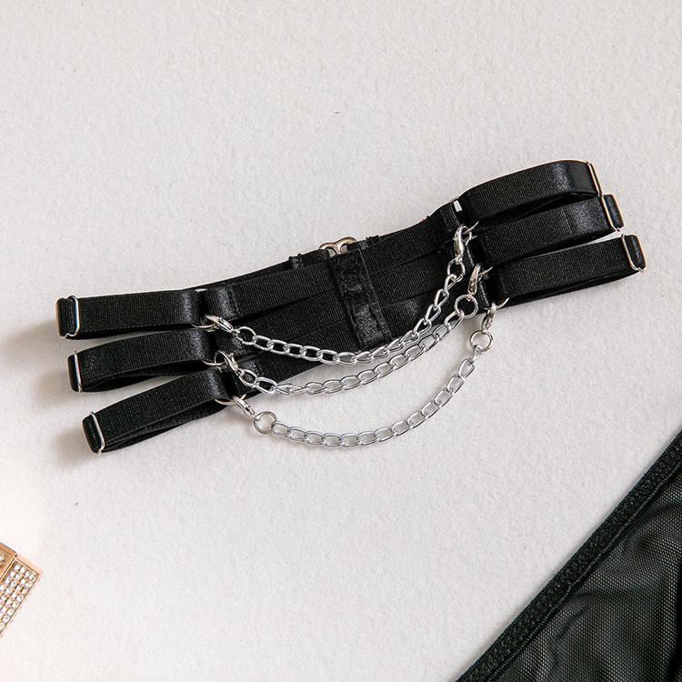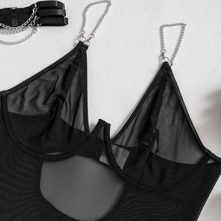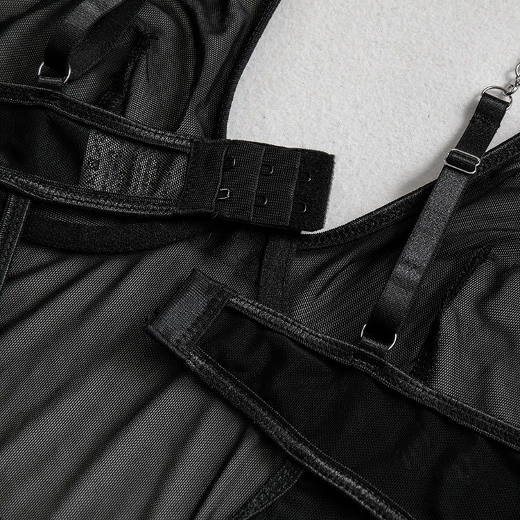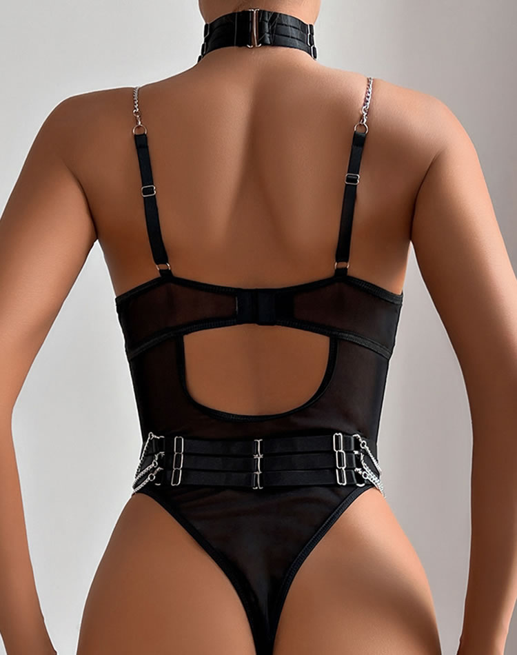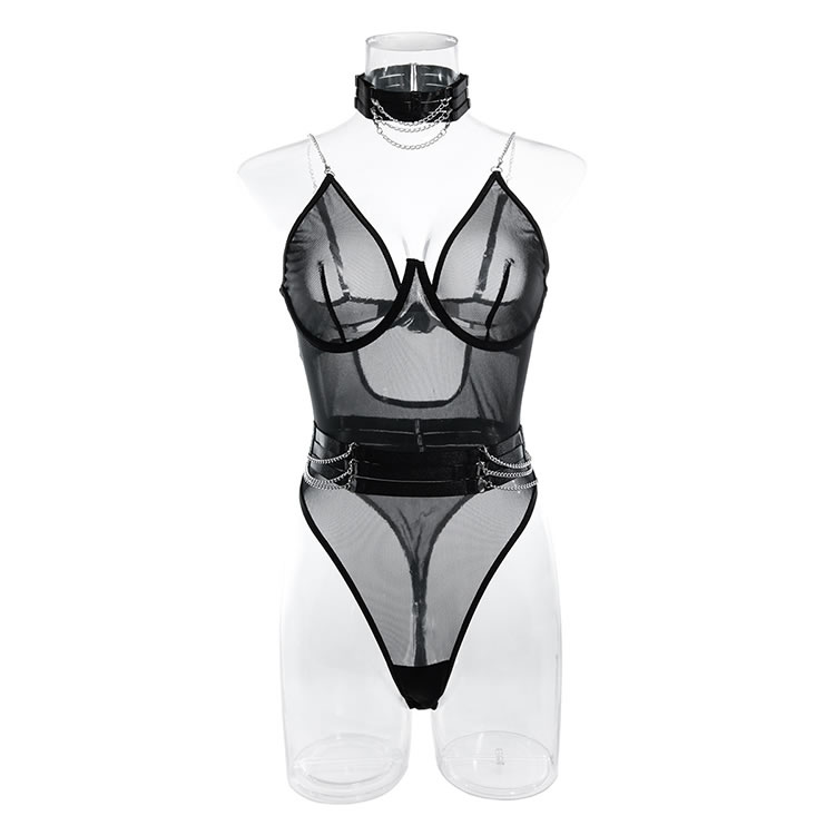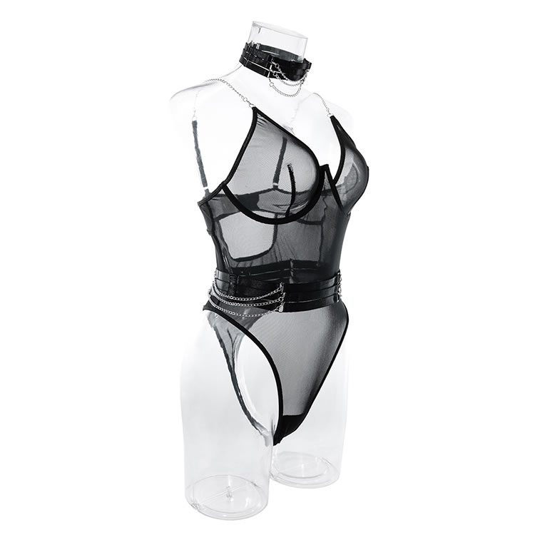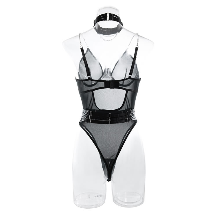 Bring some major sex appeal in this ultra sexy teddy featuring sheer mesh cups, adjustable spaghetti straps, a hook and eye back closure, a back keyhole opening, and a cheeky cut back, a choker, and a matching garter belt.