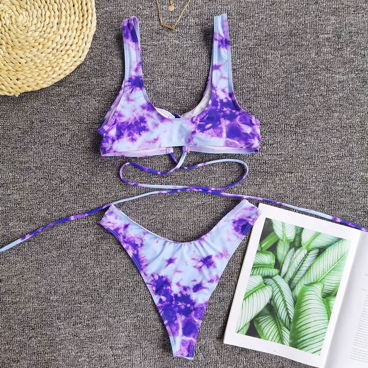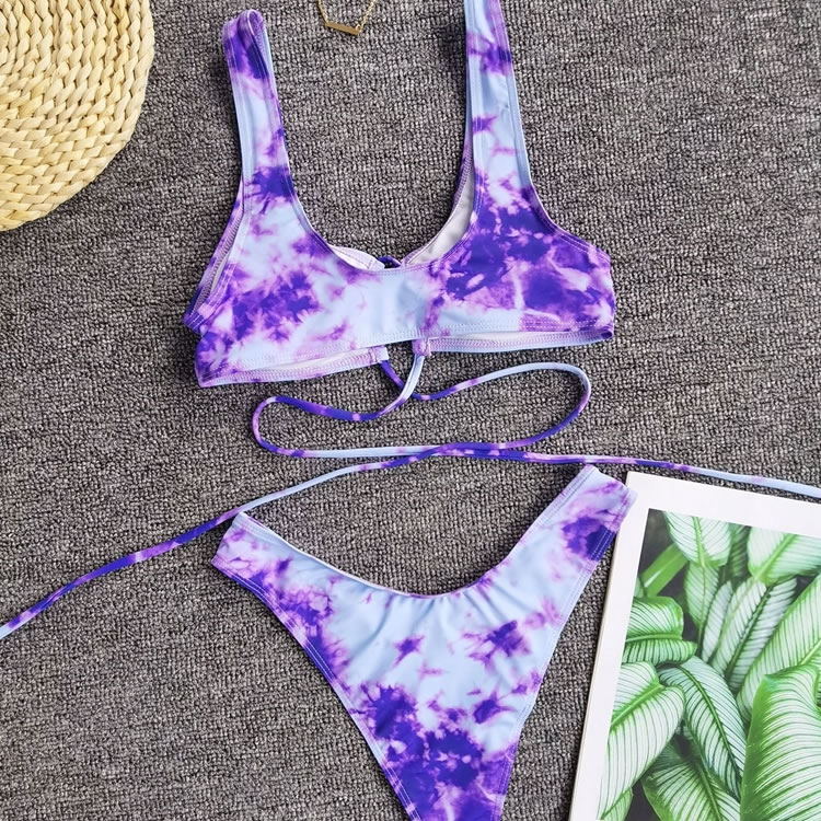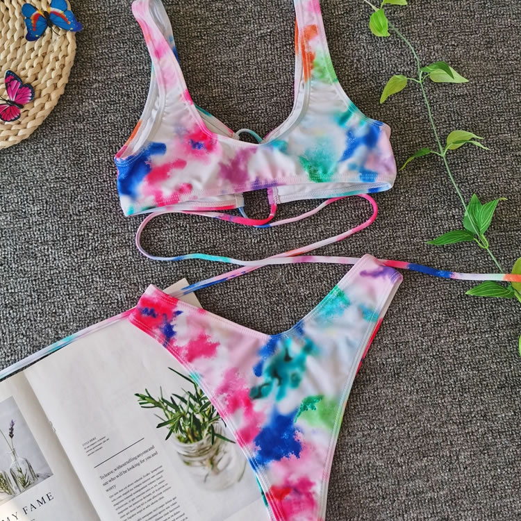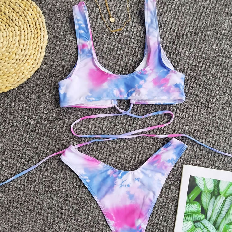 Devote yourself to the sun-soaked beach in this stunning tie dye two piece swimsuit featuring a scoop neckline, an open bust panel with lace-up detailing, thick shoulder straps, and a matching high waisted bottom with a cheeky cut back.