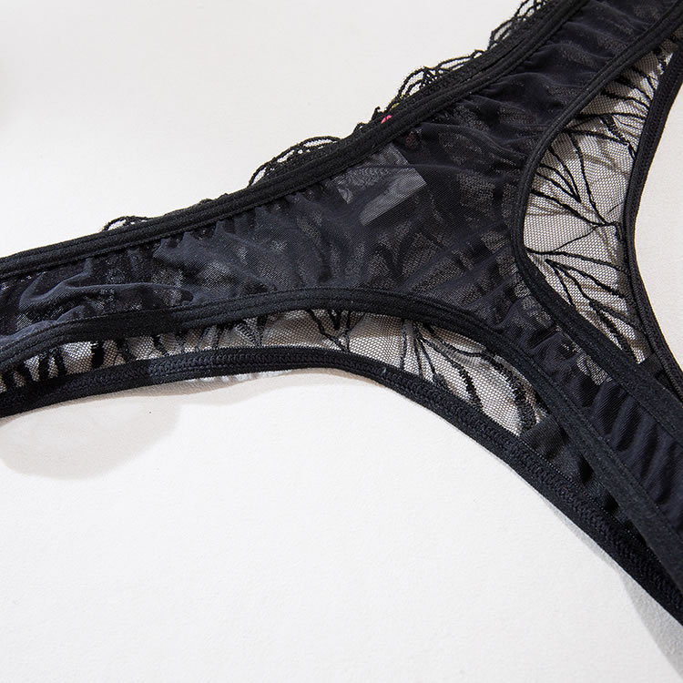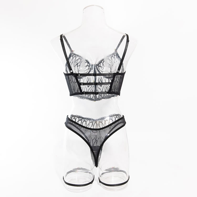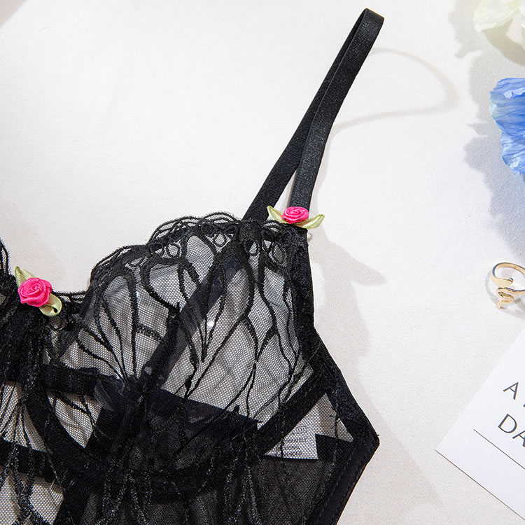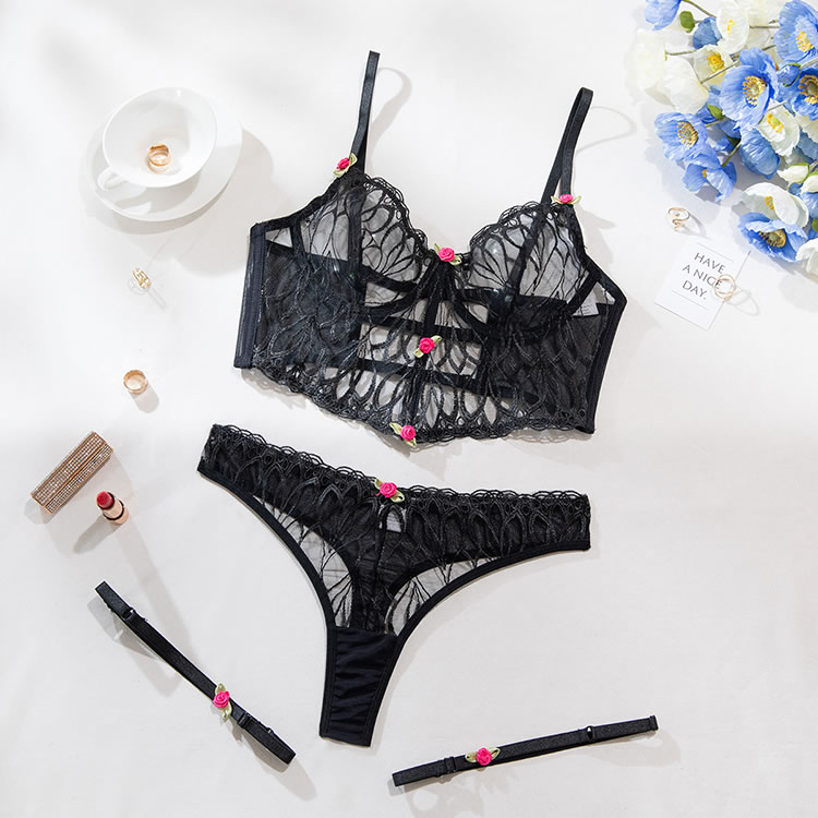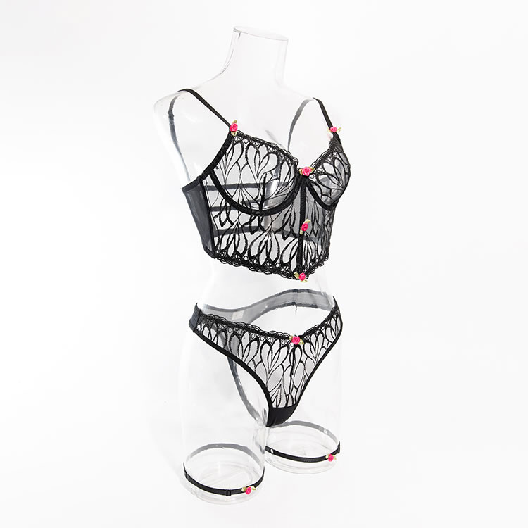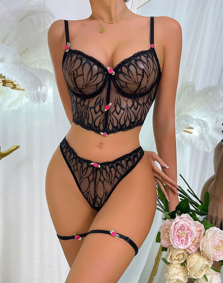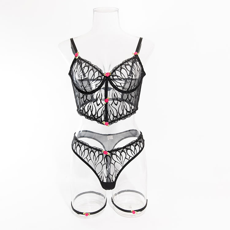 Ignite your passion with this alluring lace bra set. Available in black, this three-piece ensemble includes a sheer mesh underwire bra with adjustable straps and a hook back closure, complemented by wraparound leg garters and a matching cheeky panty.