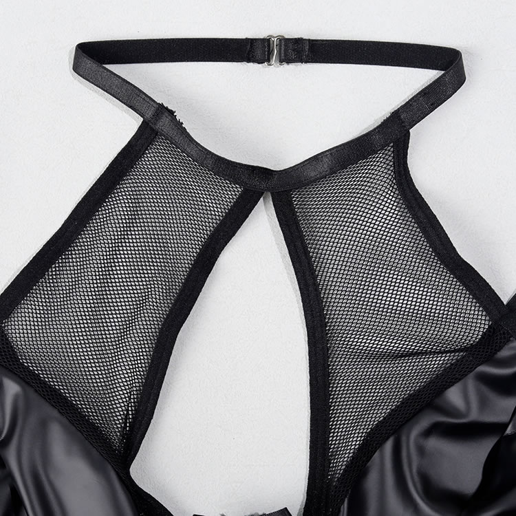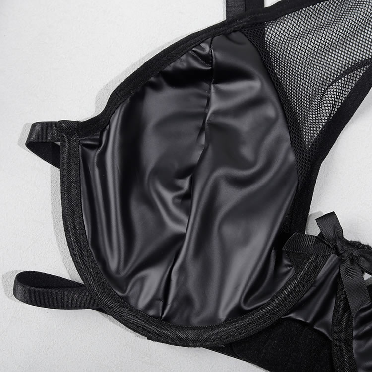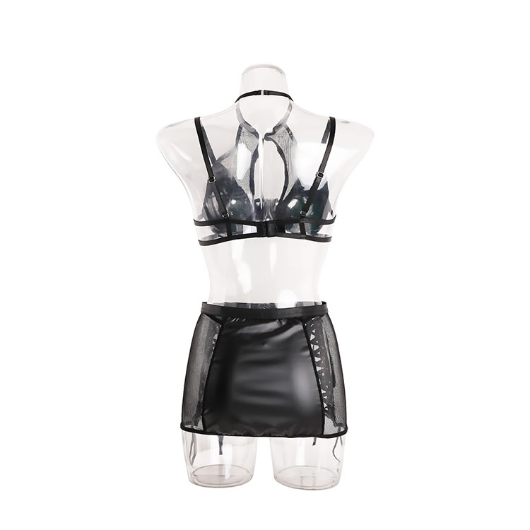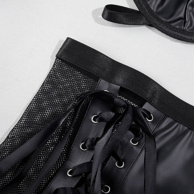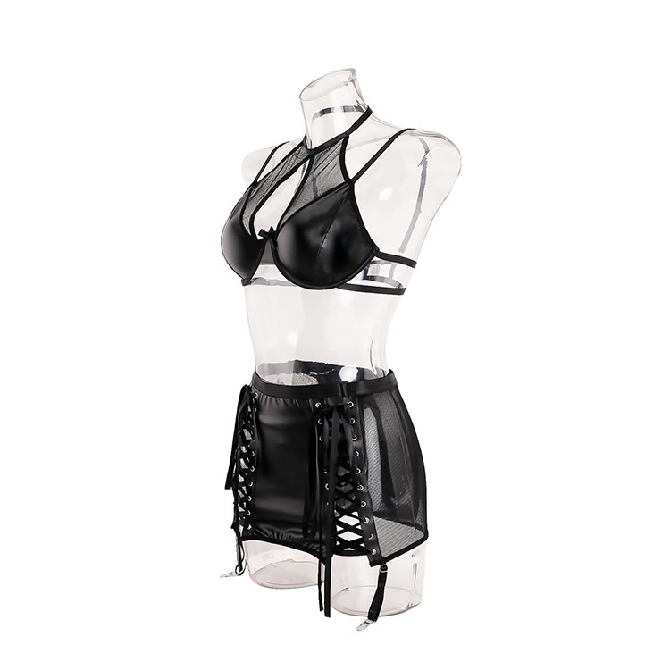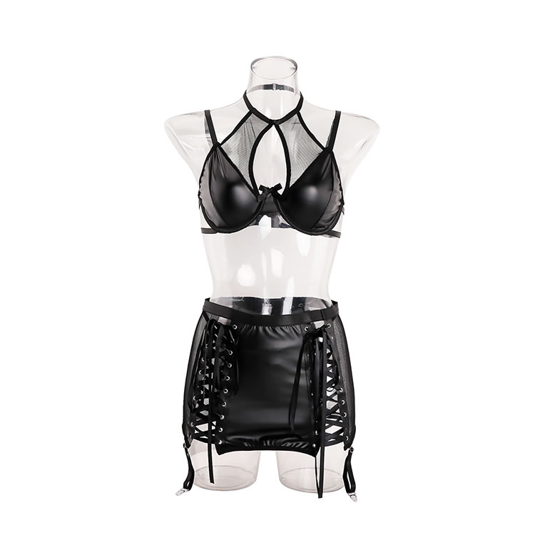 Channel your inner vixen with this bold and edgy lingerie set. Crafted from a sleek, faux leather material, this three-piece ensemble makes a powerful statement. The set includes a structured underwire bra with a modern cage-like neckline, a matching mini skirt featuring daring lace-up sides with mesh panels, and delicate garter straps. It's the perfect choice for those who want to embrace a daring, dominatrix-inspired aesthetic with a touch of playful sophistication.